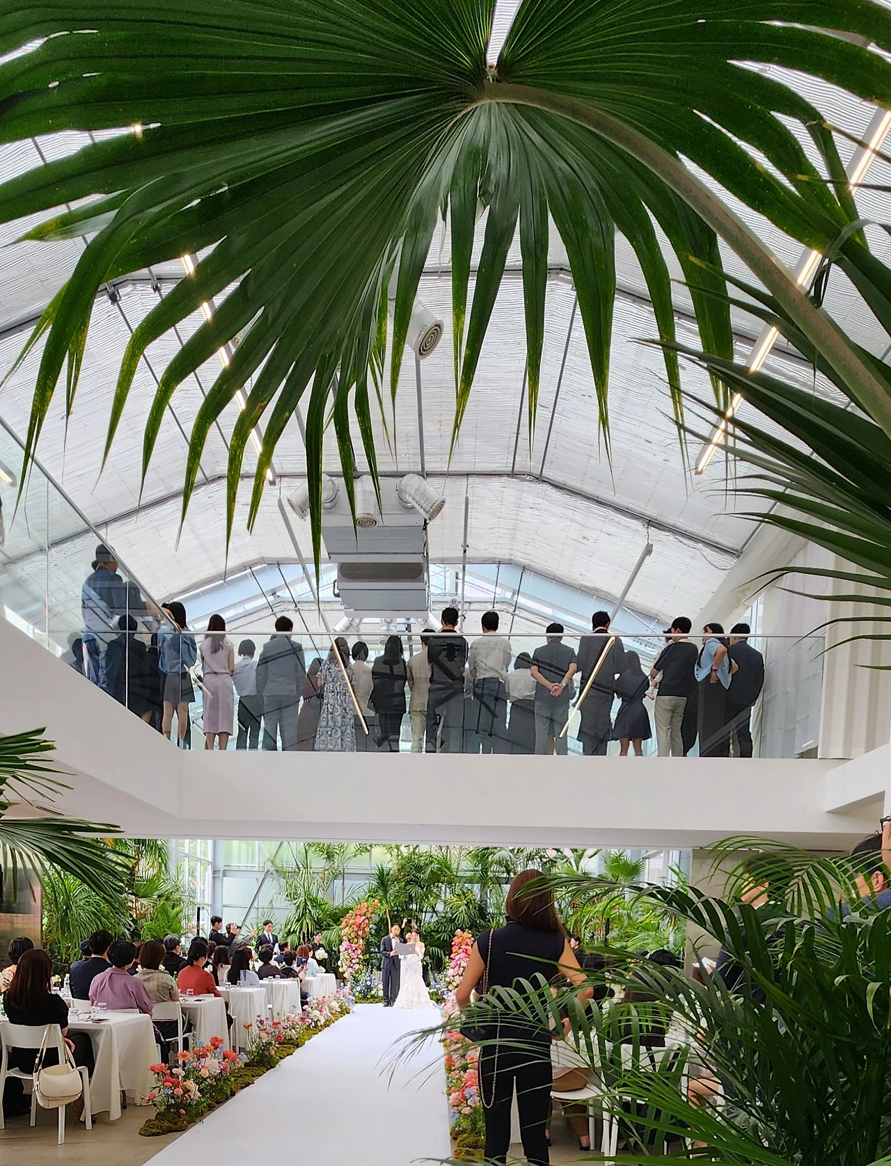 예식장은 아니고 식물원을 빌려서 했는데 유리건물 안에 푸른 숲 사이로 꽃들이 만발해 있었고 꽃보다 환한 두 사람이 멀리서도 가깝게 보였다.
