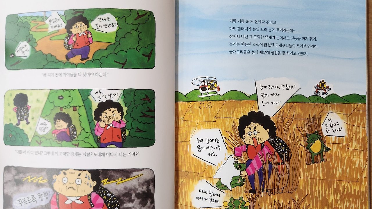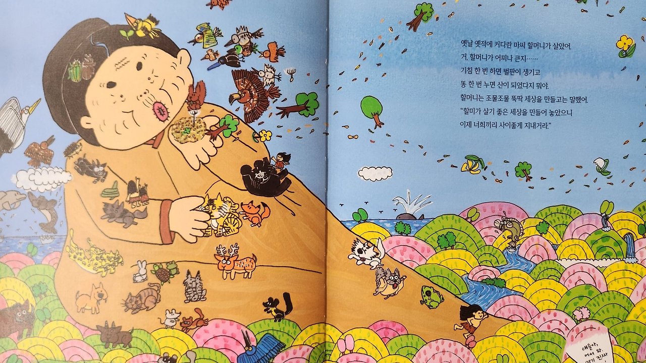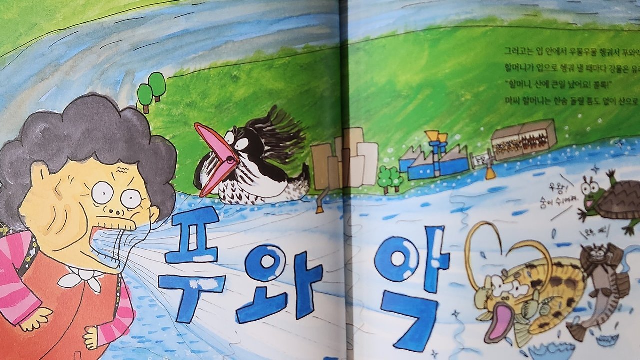 이 책의 저자는 다름 아닌 <할머니의 용궁 여행>을 쓴 권민조 작가이다. 환경 그림책으로 많이 읽히는 책 중의 하나. 매년 빠짐없이 아이들과 읽고 이야기를 나누는 그림책인데, 어쩐지 할머니가 정겹게 느껴진 이유가 여기 있었다. 마씨 할머니가 어딘가 본 듯한 얼굴처럼 낯익었던 것은 바로 할머니의 용궁 여행에서 나오는 할머니와 닮았기 때문일지도 모르겠다.