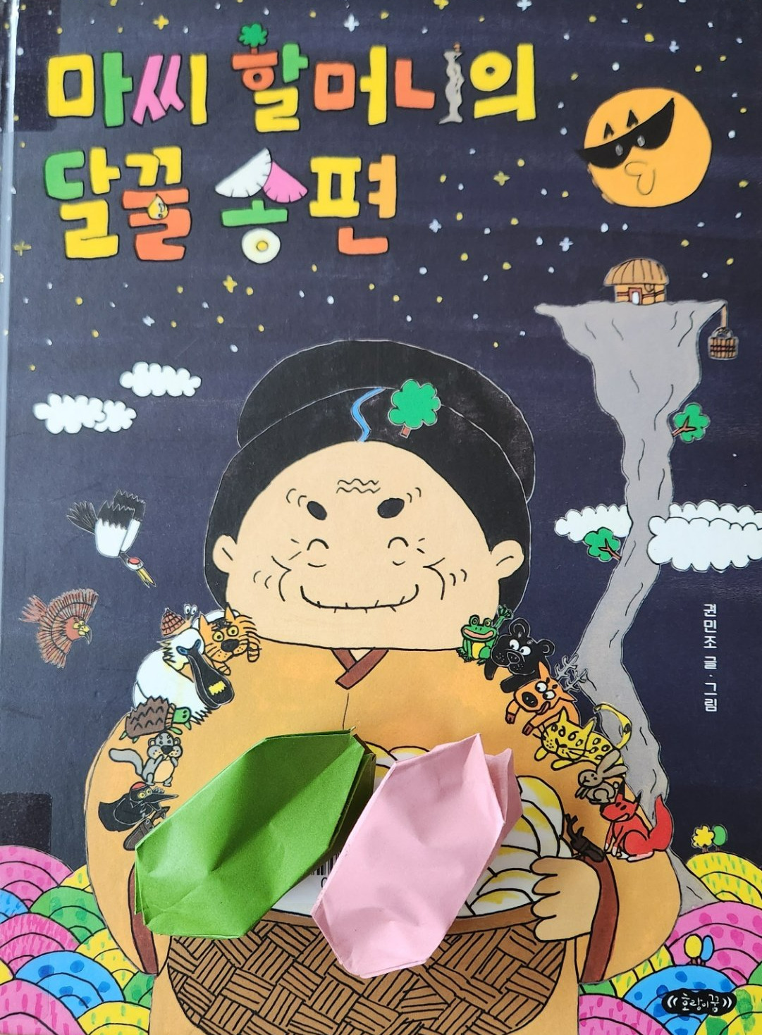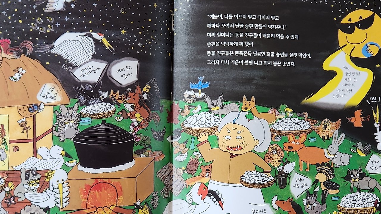 아이들과 추석을 맞이하기 전에 '한가위' 관련된 책을 읽어주고 싶었다. 학교 도서관에서 발견한 반가운 책 하나. <마씨 할머니의 달꿀 송편>에서 마고 할머니가 송편 하나 먹어보라고 손을 내민다. 마씨 할머니의 정겨운 표정, 꿀이 똑똑 떨어지는 달님의 표정에 아니 가져올 수가 있었겠나.