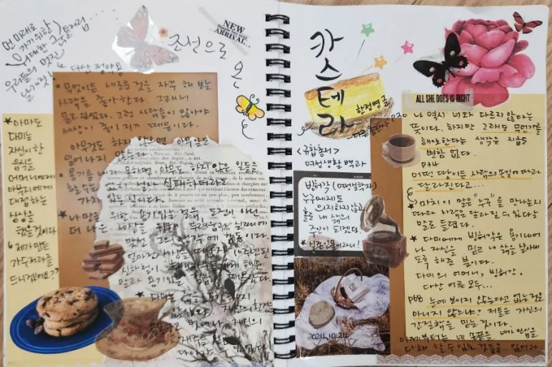 이번 다꾸의 포인트는 다이어리를 꾸밀 때 카스테라의 느낌을 담고 싶어 색상지를 덧대어서 꾸며보았다. 처음엔 모르겠지만 설명을 들으면 아마도 '아하, 카스테라를 표현한 것이구나.'하고 뒤늦게 카스테라 느낌을 받을 수 있을 것이다.