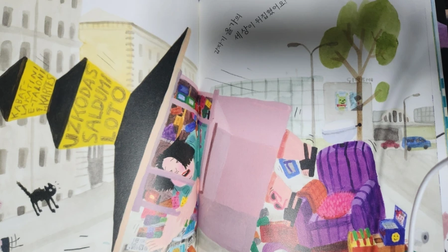 올가에게 지루하리만치 평화롭고 평범한 일상에 찾아온 사건처럼. 배달된 신문을 들이는 순간 과자를 훔치는 아이들때문에 키오스크는 완전히 무너지고 말죠. 갑자기 올가의 작은 세상은 뒤집히고 말아요.