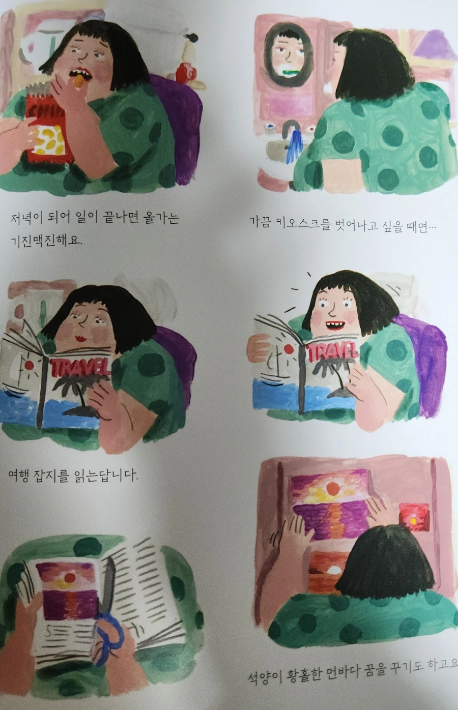어쩌면 올가 자신도 깨닫지 못했던 것 같아요. 늘 해오던 일이고 그저 삶을 받아들이며 어쩔 수 없이 주어진 삶에 순응하며 열심히 살아갔을 뿐. 다만 그녀의 무의식 중에 답답했던 마음이 여행 잡지로 답답함을 위로 받지 않았을까요?
