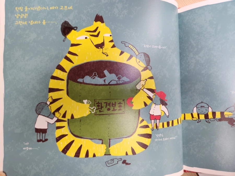 사람들이 있는 곳까지 가게 된 호랑이는 쓰레기통에서 먹을 것을 찾아 먹기도 하고, 호랑이 물품을 파는 곳도 가게 됩니다. 여기 저기 다니다보니 사람들은 호랑이가 설마 사람들이 살아가는 한 가운데 있을 거라는 생각을 못해서인지 호랑이를 놀이터로, 쓰레기통으로, 카펫으로, 눈이 나쁜 할머니는 호랑이 잠옷을 입은 손주로 착각을 합니다.