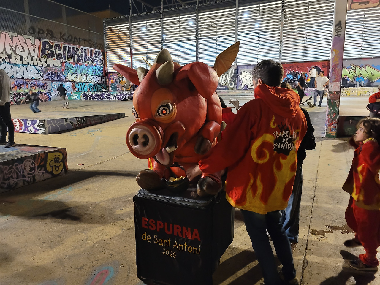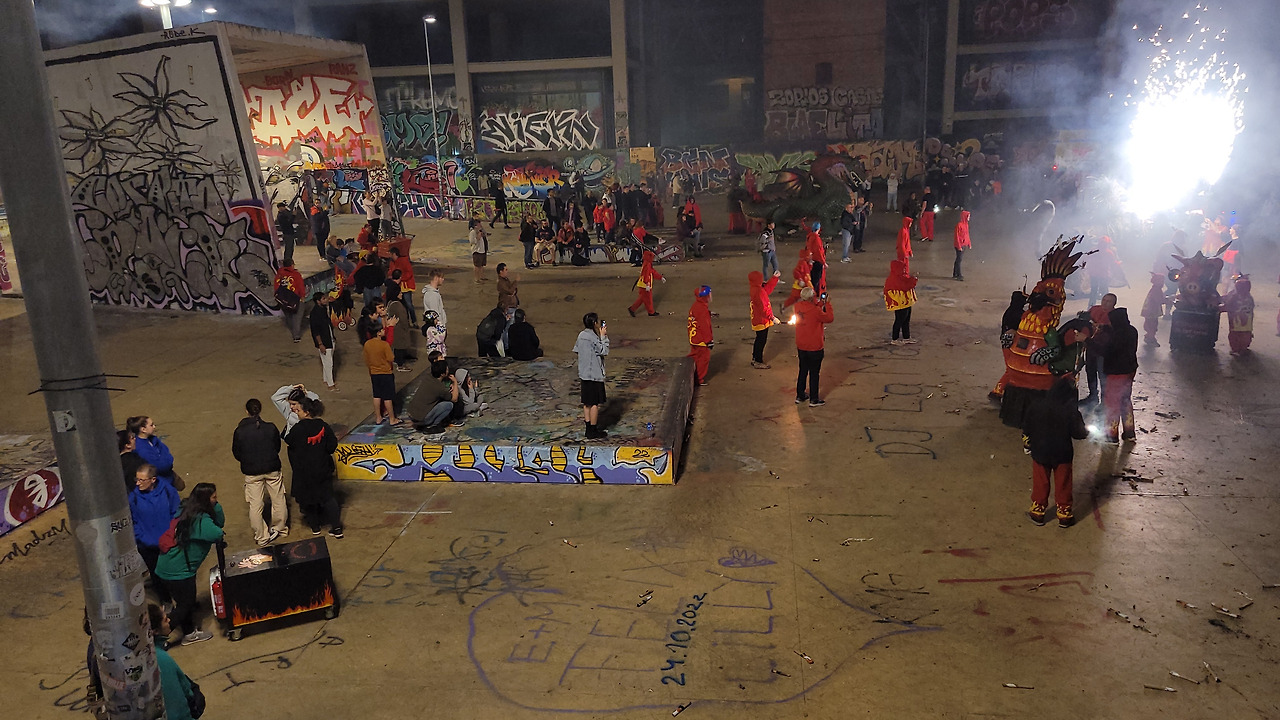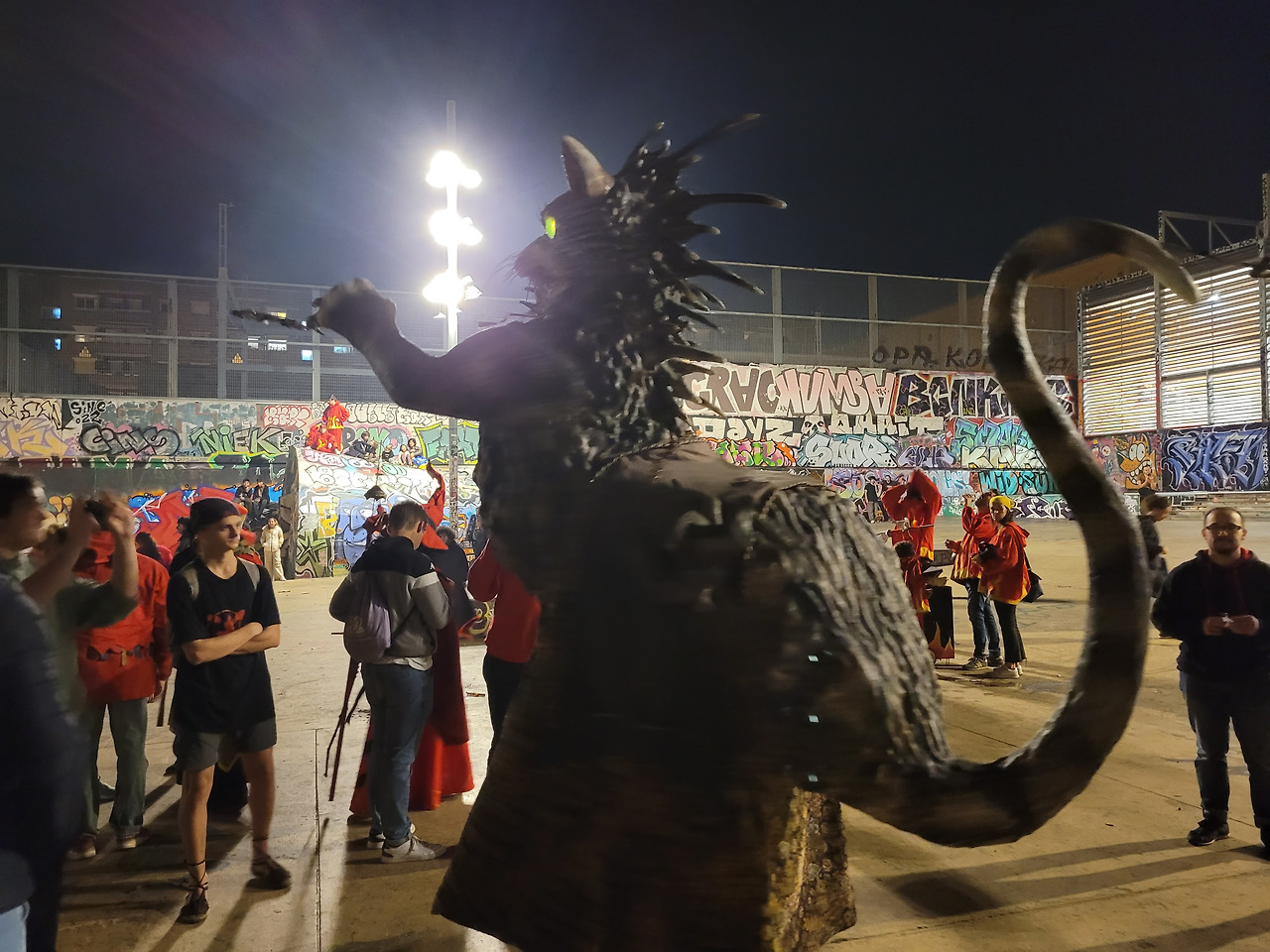 레드팀, 블랙팀이 드럼 연주를 하며 동시에 악마 형상의 인형에 설치된 폭죽에 불을 붙였다.