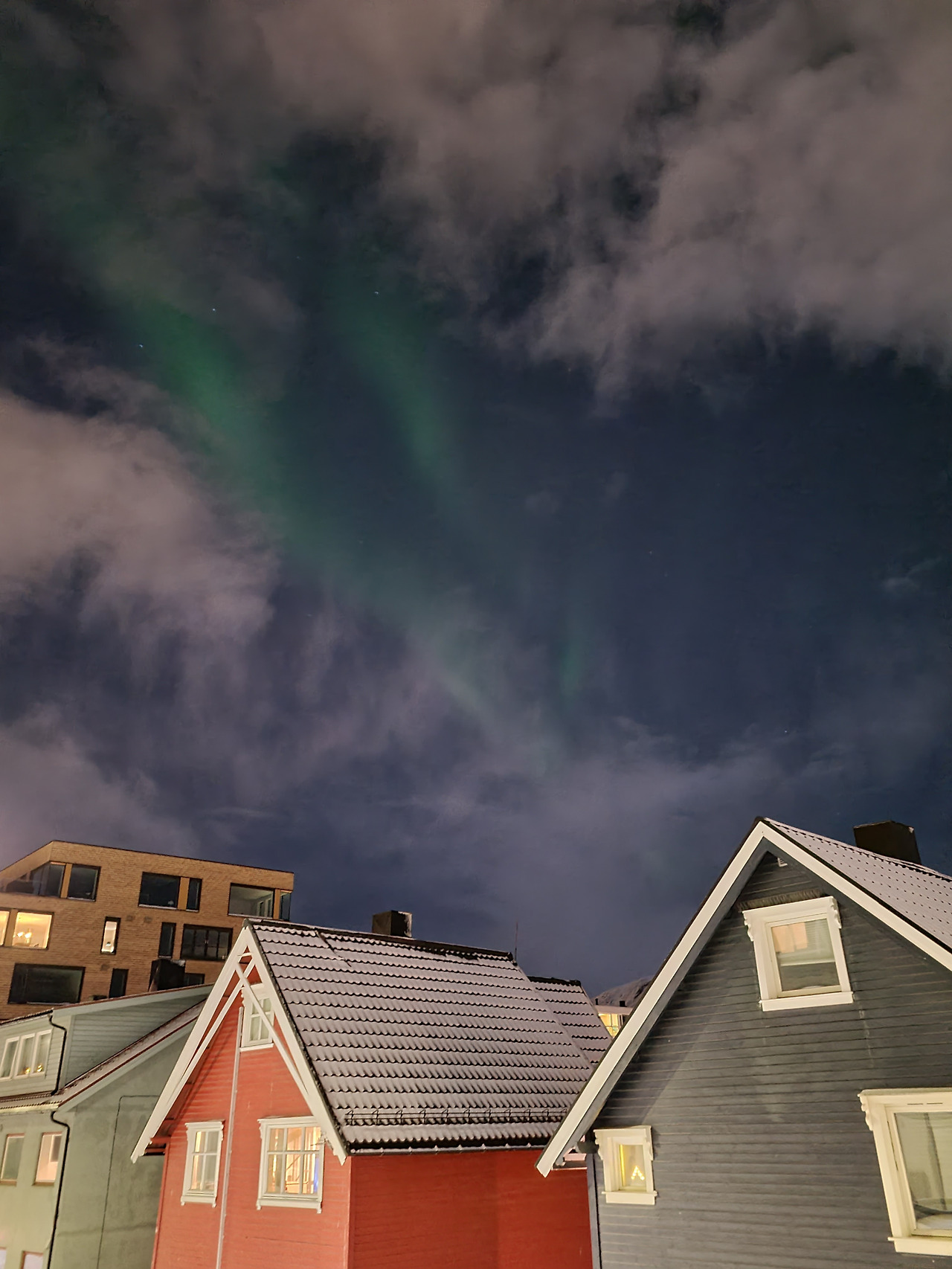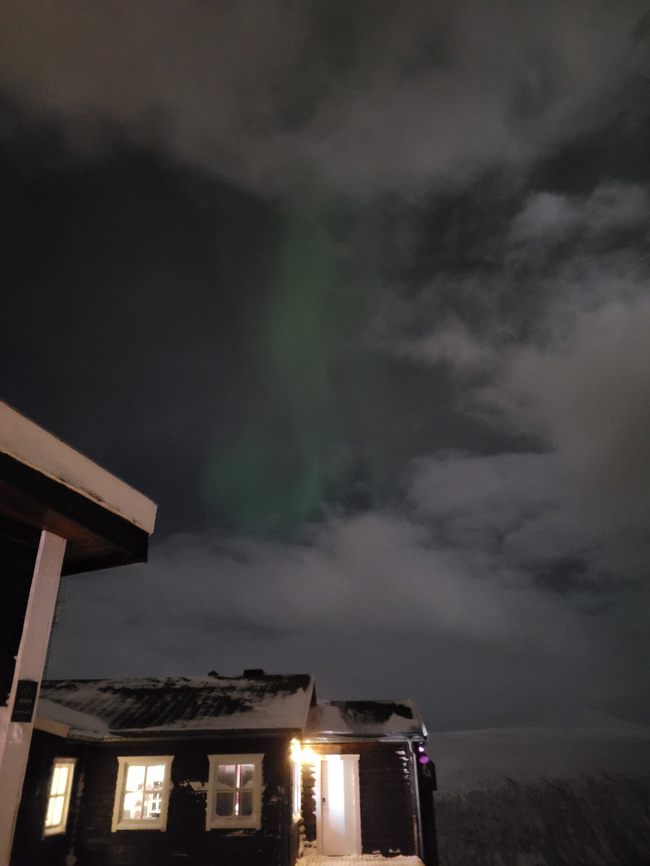아니 오로라를 여기서 본다고? 싶을 정도로 운이 좋았다. 구름이 좀 많아서 가리기는 했지만, 내 눈에 비치는 저 녹색 빛의 흐름은 신비한 자연 광경의 발견을 느끼게 해 주었다.