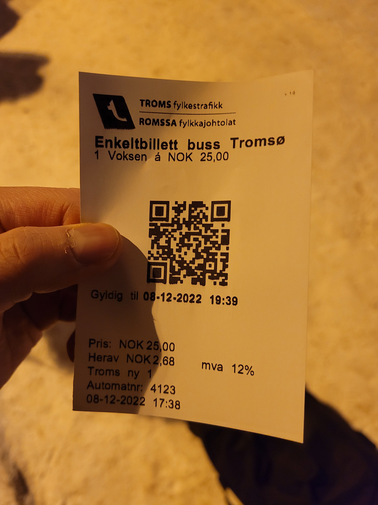 직접 싱글 티켓을 구매하면 위의 사진과 같이 종이로 인쇄되어 나온다. 티켓은 약 1시간 이내에 버스를 이용할 수 있다고 한다. 어플로 구매할 때 조심해야 할 점은 버스 회사가 다르면 소용없다는 건데, 사실 공항에서 시내 가는 버스 회사는 다 똑같아서 별 걱정 안 해도 될 것 같다. 그리고 왜인지는 모르겠는데 어플로 구매하면 35 NOK 정도로 더 비싸다.