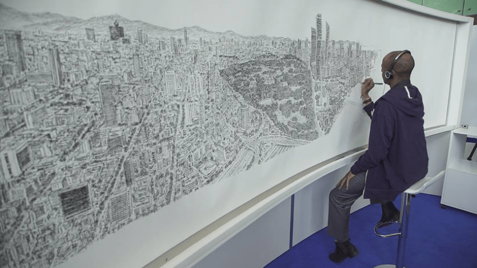 이 포스트의 상단에 삽입된 이미지는 또 다른 서번트 증후군인 스티븐 윌트셔 (Stephen Wiltsher)의 공식 그림 판매 사이트에서 판매하는 그림의 썸네일이다. 그는 한 번 본 걸 기억해서 사진처럼 머릿속에 저장한 후 그걸 그리는 능력이 있으며, 그가 헬리콥터를 타고 뉴욕 상공을 돈 후 그걸 기억해 그림으로 그렸던 과정은 유명하다**