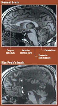 킴 픽의 어마어마한 기억력에 그의 뇌를 궁금해했던 학자들은 그의 동의를 얻어 DTI*를 통해 그의 뇌를 관찰하였다. 그의 머리는 일반적인 사람보다 훨씬 컸으며 아주 특이하게도, 좌뇌와 우뇌를 연결해주는 교량인 뇌량 (corpus callosum, 라틴어로 굳은 몸체라는 뜻)이 존재하지 않았다 [1]. 뇌량은 좌뇌와 우뇌의 정보가 교류하여 상위 정보처리단계로 가게 되는 고속도로 역할을 하는 곳인데 이곳이 선천적으로 존재하지 않았던 킴 픽의 뇌는 오른쪽과 왼쪽이 각각 독립적으로 발전한 것이다. 이는 그가 책의 양 페이지를 펼쳐서 동시에 읽을 수 있는 능력이 있었던 것과도 관련 있어 보이는데, 그는 일반 사람과는 다르게 왼쪽 눈으로 읽은 정보와 오른쪽 눈으로 읽은 정보가 동시에 처리되었기 때문에 양쪽으로 펼친 책을 완전히 ‘읽는데’ 10여 초밖에 걸리지 않았다고 한다. -다만 ‘읽었다’는 부분에 대해서는 좀 논란의 여지가 있을 수 있다. 그는 문자를 글자 그대로 흡수해 머릿속에 저장할 수 있었지만, 그의 의사소통능력으로 미루어보아 그가 읽은 내용을 토대로 행간에 숨겨져 있던 인물의 의도를 알아낸다거나 내용을 완전히 이해하면서 읽었다고 보기는 어렵다- 대신 그의 좌뇌와 우뇌는 많은 연결이 다른 사람과는 완전히 다른 방식으로 형성되어 있었던 것으로 보인다.