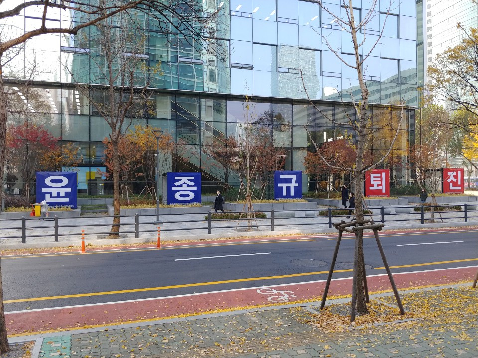 그곳은 현수막 명당으로 보였다. 여의도역에서 샛강역 방향으로 걸어가는 사람이라면 윤종규 퇴진을 안 보고 넘어갈 수 없다. 좁은 길목에서 통행세를 요구하는 깡패 무리 같다. 나는 점심밥 먹으러 나왔을 뿐인데 시선과 의식을 강탈당했다. 메뉴에 대한 고민 대신 윤종규가 무슨 잘못을 했는지 궁금해하고 있다.