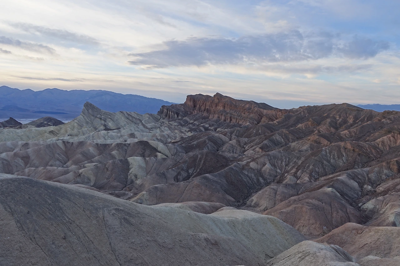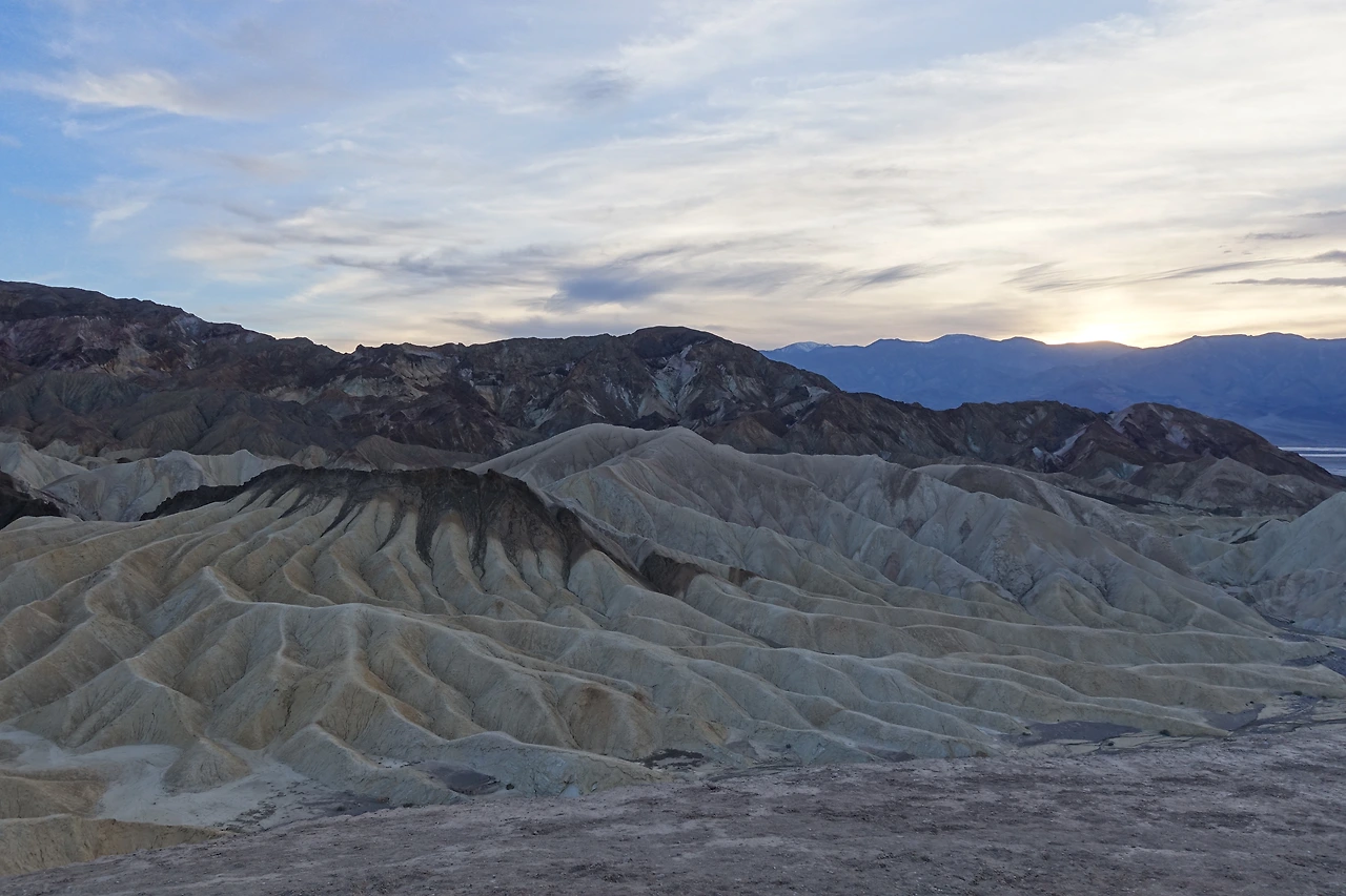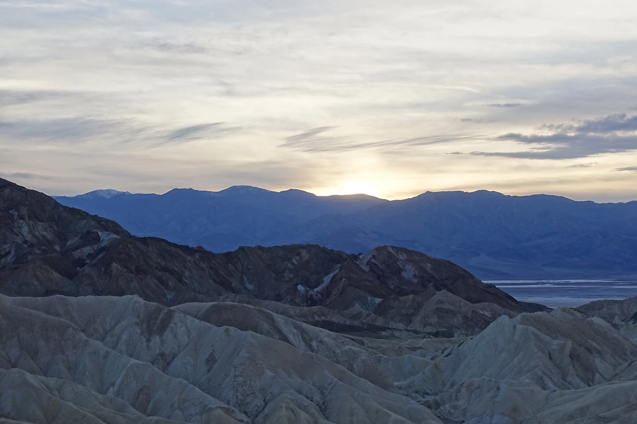 마지막으로 자브리스키 포인트를 찾았다. 우리는 일몰을 보기 위해 이 포인트를 이 여행의 마지막에 놓았다. 이 곳은 해가 지는 것도 멋있지만 해가 뜨는 것도 멋있다고 한다. 도착했을 무렵에는 캠핑카 몇 대가 자리하고 있었다. 그네들은 해가 뜨는 것도 볼 생각인 듯했다. 미국에 사는 지인의 말로는 데스벨리가 사막인 데다가 도시와는 동떨어져 있고 사람도 없어서 밤에 캠핑하면서 별보기가 최고라고 했다. 캠핑카를 보니 나도 별이나 보면서 하룻밤 지내고 싶었지만 사막에서 아무런 준비 없이 캠핑을 했다가는 얼어 죽기 십상 이리라. 아쉽지만 이번은 해지는 것만 보고 내려와야 했다. 날씨가 맑아서 해가 지는 것은 아주 잘 보였다.