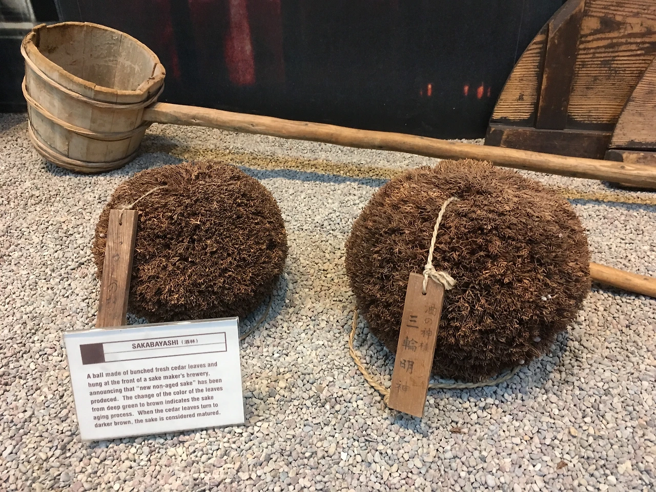 이 박물관에서 보았던 것 중에 가장 눈길이 갔던 것은 사람 머리통만 한 덤불처럼 보이기도 하고 수세미처럼 보이기도 하는 볼이었다. 이 볼의 이름은 '사카바야시'. Cedar라는 나무의 나뭇잎 다발로 만든다고 하는데, 전통적으로 새로운 사케가 나오면 이 볼을 사케 양조장 대문 앞에 걸어둔다고 한다. 이 볼은 처음 걸 때는 초록색인데, 시간이 지날수록 갈색이 돼가고 그러면 지나는 사람들이 색에 따라서 그 사케가 얼마나 숙성되었는지를 알 수 있게 된다. Cedar는 한국어로 개잎갈나무라는데 소나무처럼 생겼다.