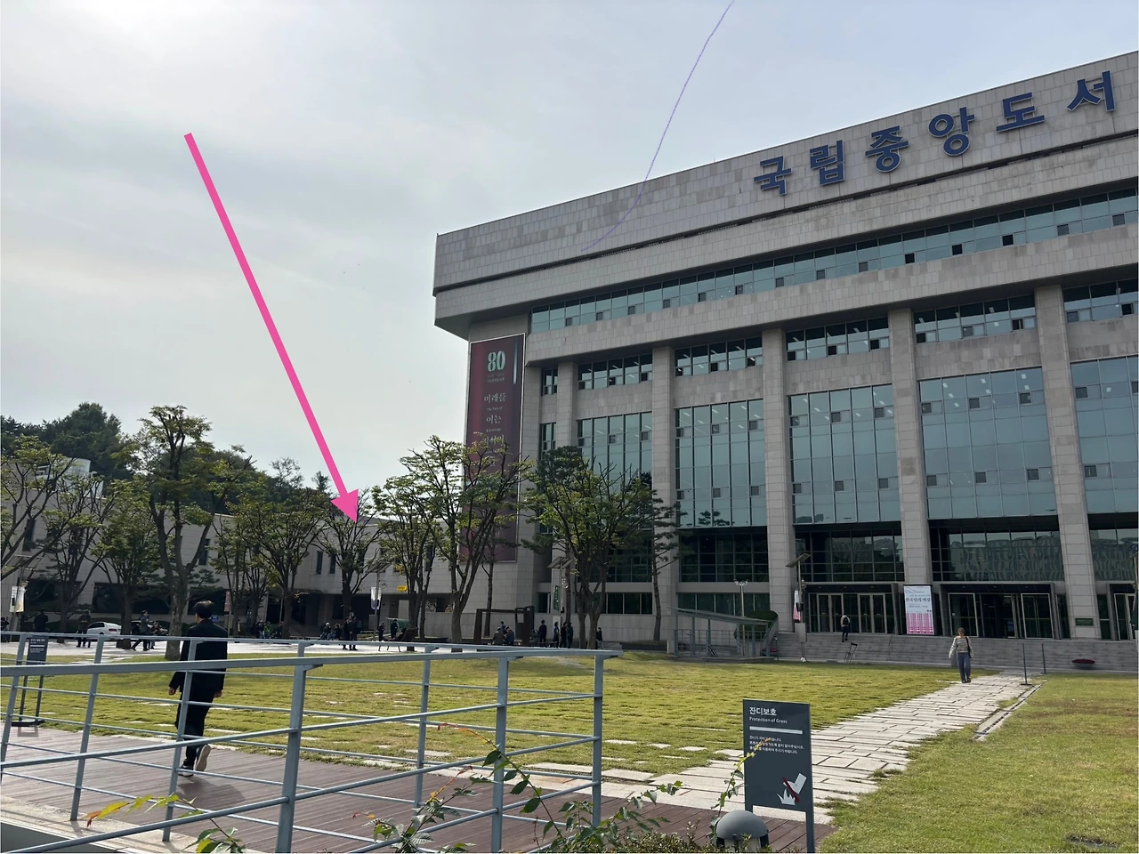 그다음, 아래 사진의 화살표가 있는 건물 쪽으로 대각선으로 이동한다. 본관이 아닌 자료보존실에 납본을 해야 하는데, 이 방향으로 걸어가다 보면 자료보존실 안내표시를 찾을 수 있다. (자료보존실은 사진에 보이지 않는 깊숙한 위치에 있다.)