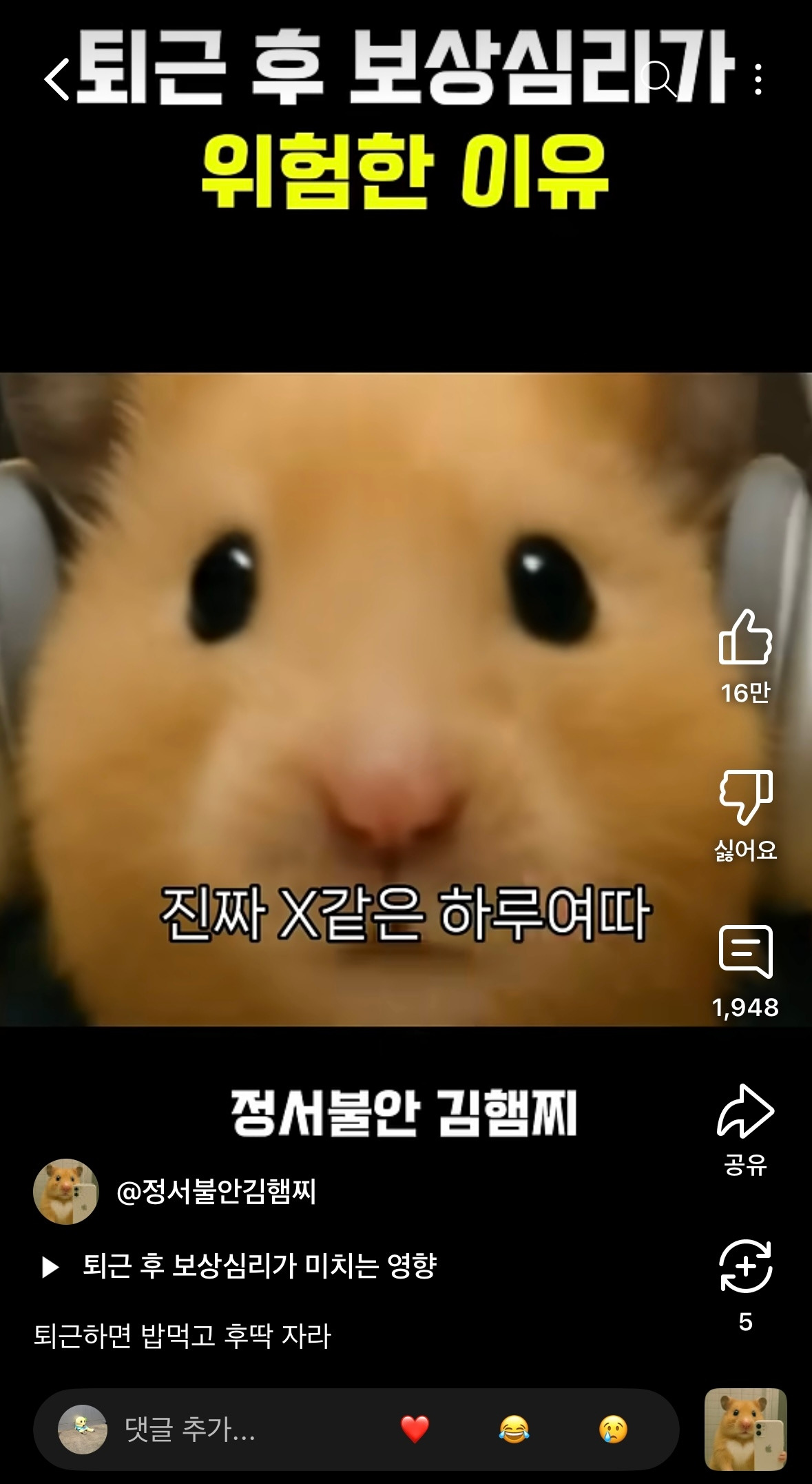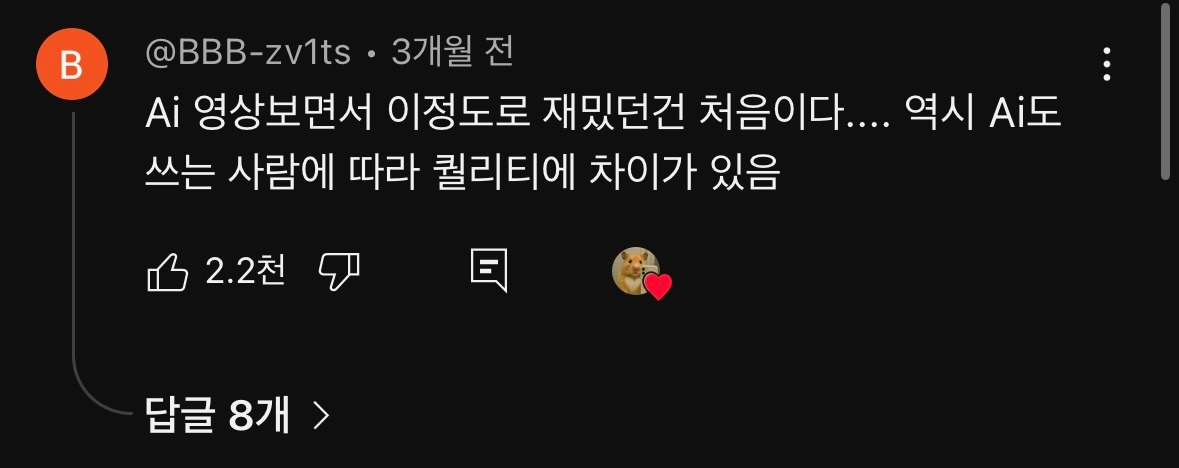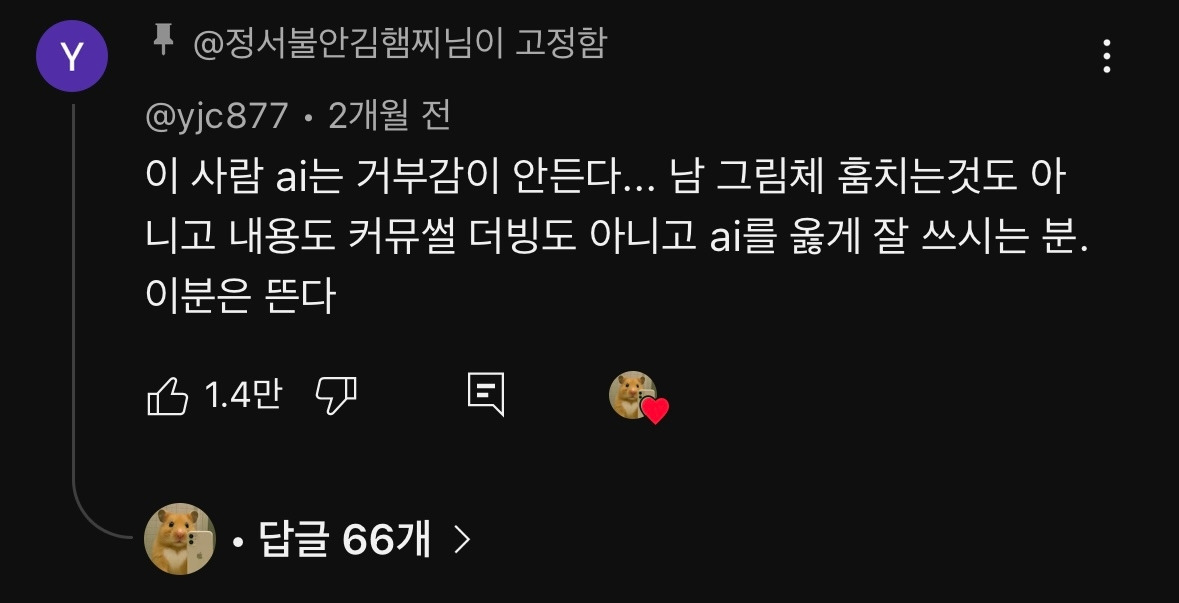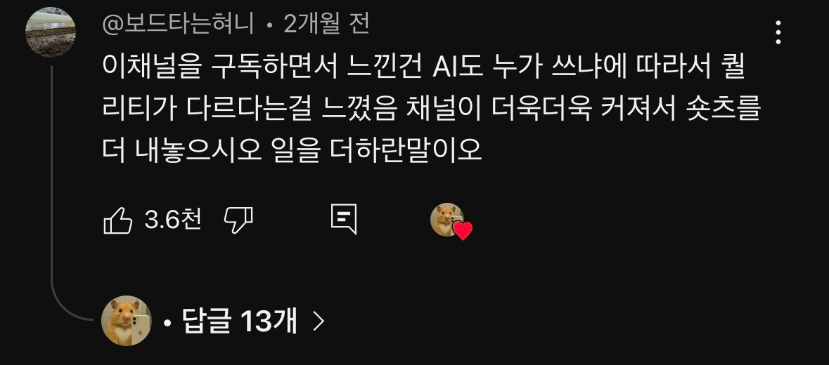 '이 사람의 AI는 거부감이 안 든다', '역시 AI도 쓰는 사람에 따라 다르구나', '다른 양산형 AI 유튜버들과는 다르다' 등의 반응을 보면, 확실히 요즘 대중이 양산형 AI에 신물이 나있음을 확인할 수 있다. 요 귀여운 햄스터의 일상 영상은 이 흐름의 빈틈을 잘 찌른 것. 지금껏 보지 못했던, AI를 통한 확실한 '브랜딩'이다. 현대인의 스트레스를 대변하는 귀여운 AI 캐릭터. 이제는 AI 캐릭터로도 브랜딩이 충분히 가능하다는 걸 이 채널이 증명해냈다. 이 브랜딩의 핵심은 결국 또 '컨셉'과 '스토리'다. ‘내 얘기 같다’는 몰입감을 주는 스토리. 그리고 이름과 성격, 직업, 말투까지 페르소나가 구체적으로 설계된 동물 캐릭터. 평면적인 햄스터가 아닌, 살아 숨쉬는 '사람 같은' 햄스터.