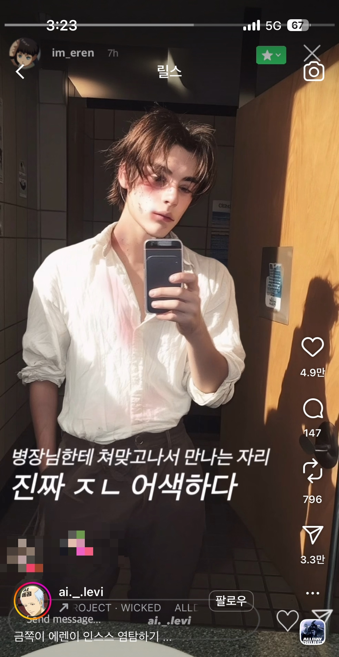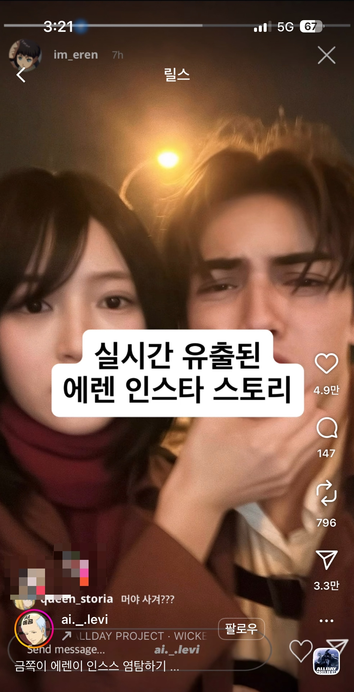 최근 2030세대에 애니메이션 '진격의 거인'(이하 진격거) 붐이 일면서, 인스타그램에서 진격거 'AI 실사화' 밈을 쉽게 접할 수 있게 됐다. 그냥 쉽게 접하는 정도가 아니라, 넘길 때마다 나오는 수준이다. 오타쿠인 내 알고리즘이 애니 특화여서 그런 것도 있겠지만, 그걸 차치하더라도 조회수나 좋아요 수가 장난이 아니다. AI 실사화만 제작하는 계정들이 우후죽순 생겨나고 있을 정도. 생성형 AI가 아무리 MZ에게 익숙한 툴이 되었다지만 이건 익숙해지는 속도가 빨라도 너무 빠른 것 아닌가? 특히 몇 년 전까지만 해도 AI 영상은 어색하거나 ‘딱 봐도 합성’ 느낌이었는데, 이제는 실사 수준으로 구현이 가능해져 가끔은 AI와 실사 영상이 분간이 안 간다.