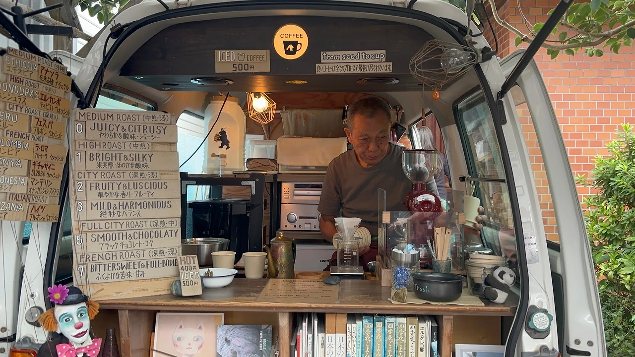 셋째 날엔 바닷가 마을 에노시마의 숙소에서 묵었는데, 가성비 료칸이었다. 이 료칸의 주인도 할머니셨다. 체크인 당시 영어를 전혀 못 하셔서 일본어로만 설명하시는데 알아듣느라 조금 힘들었지만, 할머니가 나를 진심으로 친절하게 응대하고 계신 것 하나는 확실히 알 수 있었다. 그리고 숙소에서 나와 바닷가를 구경하고, 하세데라'라는 사원에 가는 길에 우연히 귀여운 커피 트럭을 발견했다.