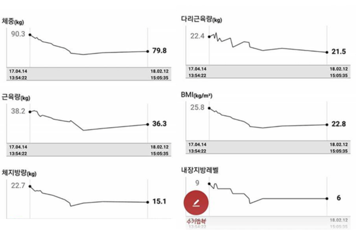 다이어트 후 반 년이 지났다. 그럼 지금 내 몸의 상태는 어떠할까? 체중이 다시 원상태로 회복을 되었을까? 아니면 그대로일까? 피터 드러커의 명언을 언제나 강조하는 것처럼 계측되지 않는 것은 관리될 수 없다. 그래서 꾸준히 한 달에 한 두 번은 계속 인바디를 측정했다. 그리고 그 결과는 아래의 그래프에 나와있다.