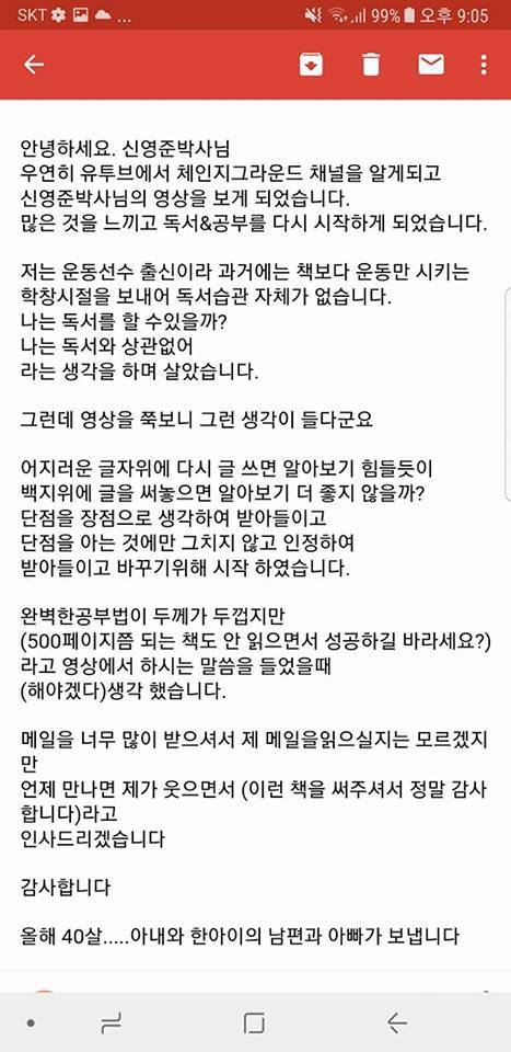 요즘은 예전과 다르게 유튜브 때문에 나 (혹은 고영성 작가님)을 알게 되어서 지식을 얻고 동기부여를 받아서 결국 독서로 이어지고 더 나아가 삶의 긍정적 변화까지 만들어 냈다는 분들의 메일을 자주 받는다. 이런 메일을 받을 때 마다 그 기분을 어떻게 표현해야 할지 말로 다할 수가 없다. 우리에게 감사하다고 메일을 주시지만 그런 변화의 간증(?)을 목격함으로써 우리의 노력이 헛되지 않았음을 깨닫는 것 같아서 오히려 우리가 더 감사하다. 이런 관계를 윈윈이라고 하고 서로 힘이 되어서 함께 어제보다 더 훌륭해지는 작용을 나는 진정한 시너지라고 정의하고 싶다. 감사의 메일을 많이 받지만 특히 이렇게 한 40살이 된 어떻게 보면 인생의 모멘텀이 충분히 커서 바뀌기 힘들 것 같은 분들의 감사의 메일을 받을 때면 정말 울컥하기도 한다. 앞으로도 정말 미친 듯이 꾸준하게 컨텐츠를 업로드하여 어디선가 변화를 갈망하는 그 누군가에게 작은 기회와 계기가 되고 싶다. 우리는 그렇게 함께 성장한다.