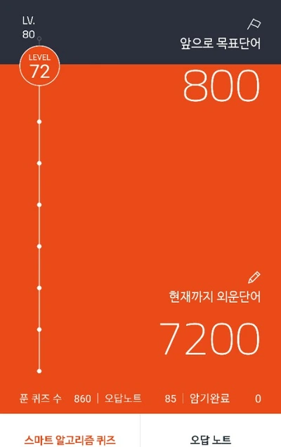 현재까지는 7200단어를 빠르게 퀴즈를 풀어보았다. 나머지 800개는 확실히 기억이 나지 않기에 더 복습을 해본다음 풀기로 해야 겠다.