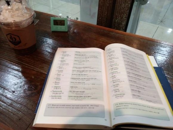 단순히 책에 단어를 외우면서 하는 게 아니라 예문을 단어 옆에 쓰면서 외울려고 노력했다. 단어를 몇번씩 쓰면서 외우기 보다는 예문으로 그 단어의 뉘앙스를 알아가는 게 나한테 가장 효율적인 방법임을 깨달았다.
