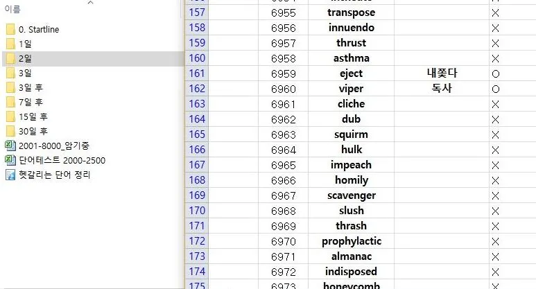 그 다음은 1, 2, 3, 3일후, 7일후, 15일후, 30일후 라는 폴더를 만들고 엑셀파일의 제목을 “날짜_범위” 식으로 만들었다. ‘1일’ 이란 폴더에 있는 단어를 본 후 다음 날짜로 이름을 바꾸고 ‘2일’ 이란 폴더로 옮긴다. 그리고 Startline에 있던 오늘 날짜의 파일을 ‘1일’ 폴더로 옮긴 후 공부한다. 다음날에는 1일차에 공부한 ‘2일’에 있는 파일을 복습한 후 ‘1일’에 있는 파일을 복습한다. 그리고 또 옮긴다. 이런 식으로 복습위주로 진행하였고 6월 2일에 모든 파일들이 7일후 폴더로 옮기면서 1회차를 마무리했다.
