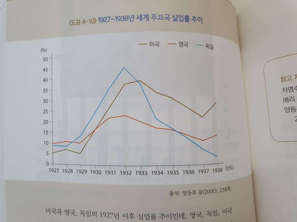 두 번째 내가 얻은 깨달음은 “금본위제”에 대한 이해이다. 창피한 이야기이지만 예전에 XX전쟁 같은 책을 읽으면서 금융 음모론에 심취해 있었고 어줍잖은 지식으로 우리도 금본위제로 얼른 회귀에 한다는 미친 소리를 친구들에게 설파하고 다닌 적이 있었다. 이런 것을 난 새롭게 통찰의 반대 개념인 “똥찰”이라는 새로운 단어를 재정의 하고 싶다. 아는 것도 없으면서 음모론 같은 것에 빠져서 그럴듯한 개소리를 하는 것을 앞으로 “똥찰”이라고 하자. 홍춘욱 박사에 책을 읽으면 금본위제를 지켜야 한다는 것이 얼마나 허무맹랑한 소리인지 금방 깨닫게 된다. 아래 도표만 봐도 금본위제를 폐지하고 통화공급량을 늘렸을 때 실업률을 얼마나 빠르게 감소 시켰는지 어렵지 않게 확인할 수 있다. 참고로 미국이 가장 늦게 폐지해서 가장 늦게 효과가 나타났다. (그리고 책에는 금본위제를 폐지 했을 때 어떤 부작용이 발생했었는지도 설명이 잘 나온다. 그러니 꼭 책을 읽어 보기를 바란다.)