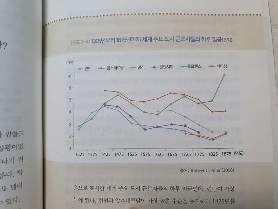 나는 방금 이 책의 3회독을 끝냈다. 그리고 내가 배운 두 가지 ‘쩌리 수준’의 깨우침을 공유하고자 한다. 예전부터 영국에서만 산업혁명이 일어나서 진짜 말 그대로 불공평하게 서양이 세계를 지배하게 되었는지 정말 궁금했다. 그리고 이번에 홍춘욱 박사의 <50대 사건으로 보는 돈의 역사>를 읽으면서 그 배경을 알게 되었다. 간단하게 이야기 하면 첨부한 그래프에서 알 수 있듯이 영국은 노동력이 부족했고 그 결과 인건비가 그 어떤 곳 보다 비쌌다. 반대로 노동력이 풍부한 나라에서는 “산업혁명”이 아닌 “근면혁명”이 일어났다. (자세한 내용은 꼭 책을 읽어 보기를 바란다.)