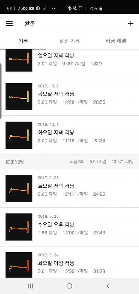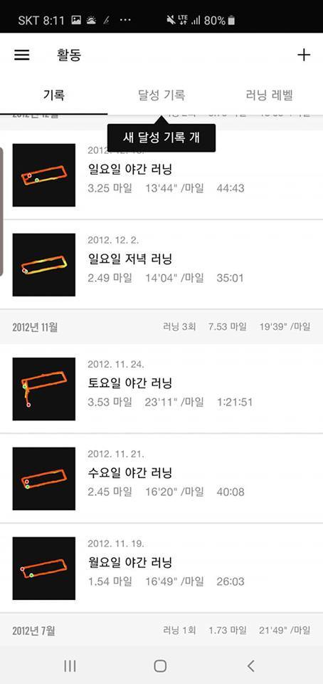 놀라웠다. 나는 이게 좋은 책이 가지고 있는 힘이라고 생각한다. 마음이 움직이면 몸도 움직인다. <시작하기엔 너무 늦지 않았을까?>는38년 내 인생에서 새로운 계기를 만들어 주었다. 기록은 기억을 이긴다. 운이 좋게 나는 나이키 달리기앱을 몇 년째 쓰고 있다. 그래서 예전 기록을 살펴보니 나는 1마일을 10분 안에 뛰어 본적이 단 한 번도 없었다. 언제나 뛰다가 숨이 차서 걸었다. 3km 이상을 완주한 적도 없었다. 항상 뛰다가 지쳐서 포기하고 걸었다. (예전에 잠깐 30대 초반에 러닝머신에서 5km를 30분 안에 뛴 적이 있었는데 내 경우에는 러닝 머신과 기록을 비교해보니 실내 러닝머신 기록이 훨씬 좋게 나오는 것이었다.)