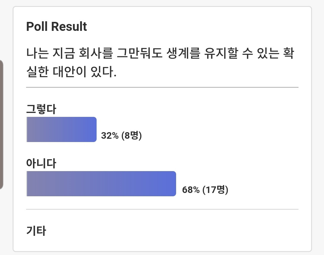조금은 추상적인 정년퇴직에 대한 질문이 아닌 구체적인 퇴사에 관한 질문을 하니 1/3정도만 대안이 있다고 대답했다. 자기계발을 하고 있는 18%의 사람도 노력은 하고 있지만 확실한 대안을 확보하기란 그리 만만한 일은 아닌 것 같다. 문제는 자기계발도 안하면서 대안도 없는 18%이다. 이런 사람들은 삶의 괴리에 속박된 사람들이다. 문제는 알고 있지만 외면으로 상황을 모면하고 있다.