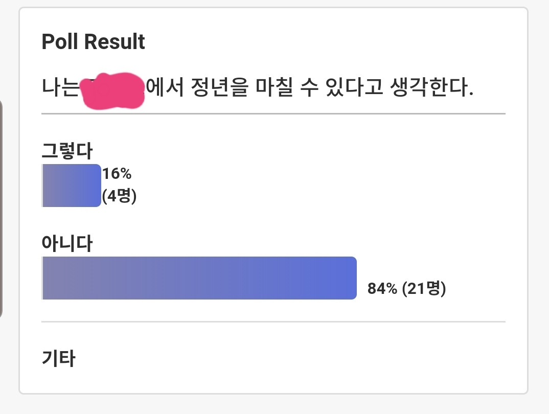 최근에 강연에서 한 질문에 대한 답은 많은 부분에 대한 인생의 괴리를 설명해준다. 우선 내가 간 기업은 평균 근속연수가 높고 조직문화도 상당히 좋은 기업이다. 그럼에도 불구하고 지금 회사에서 정년을 마칠 것이라고 생각하는 사람은 거의 없었다.