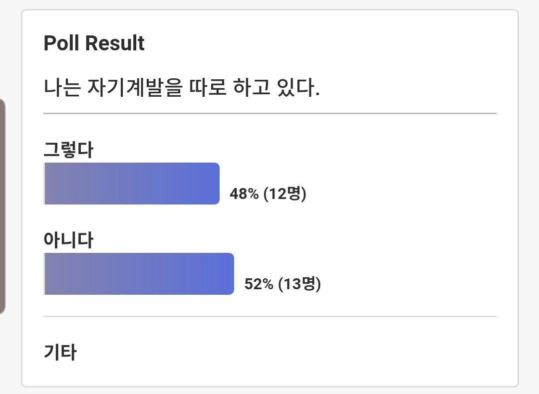 그래서 미래의 불확실성에 대비하여 자기계발을 하고 있는지 사람들에게 물어봤다. 이 회사는 의사결정권자분이 공부를 많이 해서 회사 분위기도 전반적으로 공부를 많이 한다. 그런 상황을 고려해도 자신을 발전을 위해 무언가를 하고 있는 사람은 반 밖에 되지 않았다.