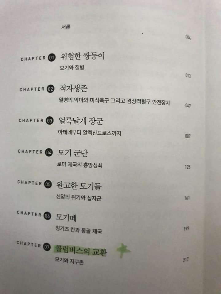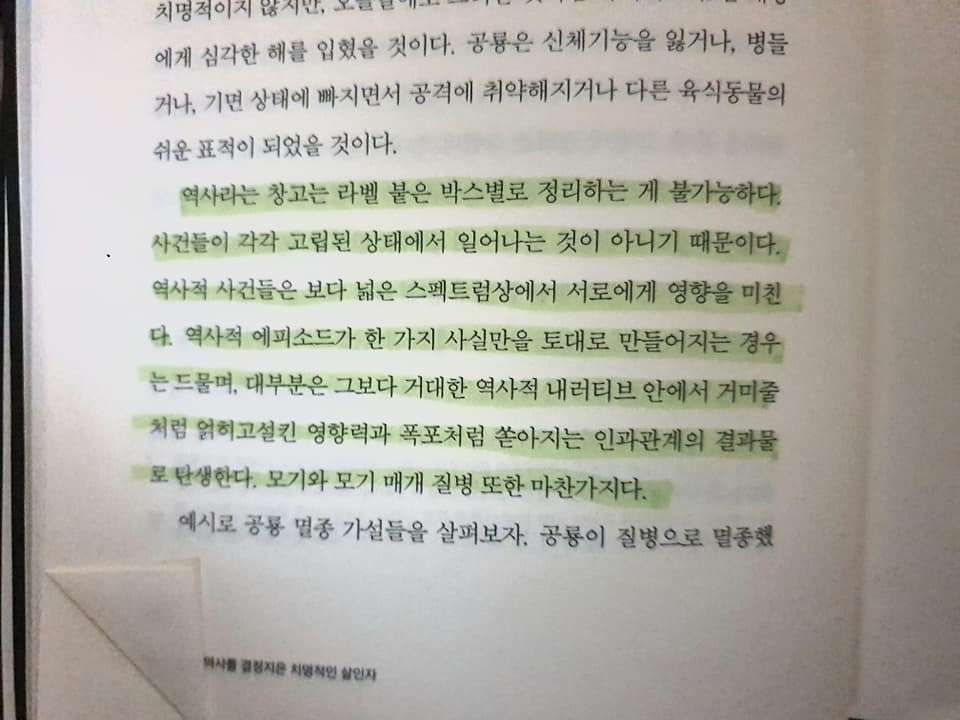 일단 나는 작가의 수준을 평가할 때 이 작가의 복잡계에 대한 관점을 파악하려고 노력한다. 쉽게 말하면 우리 삶은 예측 불가능하다고 말할 수 있어야 고수의 반열에 오를 수 있다. 세상 모든 것이 다 예측 가능하다고 떠드는 사람들은 헛똑똑이가 많다. 그래서 나는 유발 하라리를 특히 좋아한다. 그는 그의 저서에서 우리가 역사를 공부해야 하는 이유는 우리의 삶은 우연으로 구성되어 있고 역사 공부를 통해 우리는 어떤 다른 선택이 있었는지 알아야 한다는 그의 주장은 탁월함을 넘어 경외감이 드는 정말 멋진 통찰이다. <모기: 인류 역사를 결정지은 치명적인 살인자>가 바로 유발 하라리가 말한 제대로 된 역사를 공부할 수 있는 책이다. 아래 인용한 책에 일부분을 살펴보면 작가 형광팬으로 밑줄 친 부분은 전형적으로 복잡계에 대한 이야기이다. 나는 이 책을 읽으면서 기독교와 모기의 관계, 커피와 모기의 관계 그리고 콜럼버스의 철저한 잘못된 믿음과 신대륙, 아프리카 노예가 연결되면서 세계사가 어떻게 바뀌는지 보면서 온 몸에 전율이 돋았다. 이 책은 우리가 알고 있던 수많은 역사에 얼마나 모기가 결정적으로 개입하는지 설명해준다. 모기가 만약에 없었다면 미국의 남북전쟁 결과도 바뀌었을 것이다. 정말 놀라운 이야기들이다.