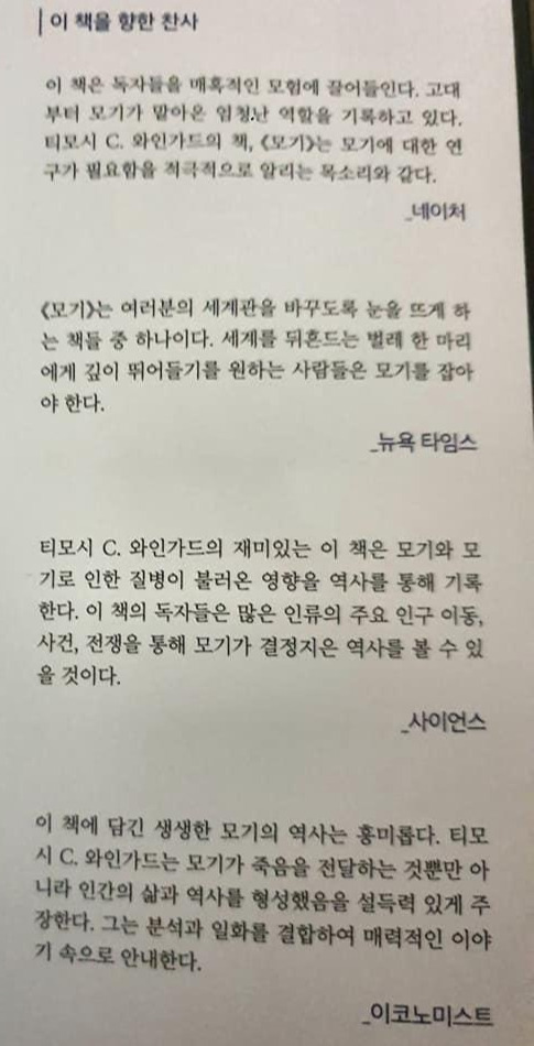 이 책은 “전지적 모기”시점으로 역사를 관통한다. 일단 레펀러스로 총균쇠나 사피엔시를 재미있게 읽었다면 이 책은 무조건 흥미롭게 읽을 것이다. 자료 조사의 수준과 책 구성 그리고 가독성도 매우 높아서 정말 훌륭한 책이다. 나 같은 듣보잡의 의견이 뭔가 의심스럽다면 <네이처>, <사이언스>, <뉴욕 타임즈>, <이코노미스트> 같은 세계 최고의 과학저널과 언론들이 이 책을 어떻게 평가했는지 보면 좋을 것 같다. 이런 세계 최고 수준의 에디터들은 절대 함부로 추천을 하지 않는다. 잘못 추천하면 본인들의 신뢰가 철저하게 무너지기 때문이다.