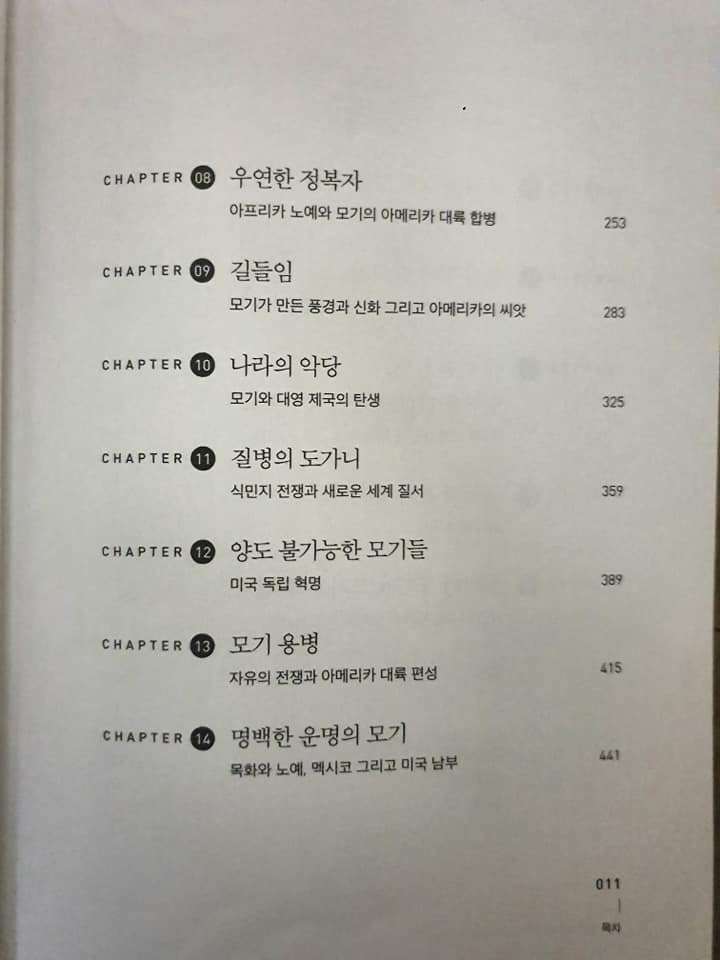 인생은 운칠기삼이다. 아무리 노력해도 되지 않는 것들이 많다. 그래서 우리는 노력하는 것 이상으로 운을 만날 접점을 늘리고 불운이 닥쳤을 때 복구할 회복력을 비축해야 한다. 이 책은 정말 모기가 어떤 편을 지지했을 때 역사가 어떻게 바뀌었는지 구체적으로 보여준다. 만약에 유럽이 희망봉에 도착했을 때 반투족에게 밀려서 해안가에 살았던 허약한 부족들이 아닌 철기와 모기로 완전 무장한 반투족이 희망봉에서 네덜란드 선단을 기다렸다면 인류의 역사는 어떻게 바뀌었을지 정말 궁금하다. 유럽 사람들이 운이 진짜 ‘오지게’ 좋았다. 그리고 세계 역사상 단일 인물로 가장 영향력을 끼친 알렉산드로스 대왕이 모기에 물려서 말라리아로 죽지 않았다면 인류 역사는 어떻게 바뀌었을까? 정말 거대한 영토를 점령했던 세계 최고의 정복자가 잘 보이지도 않는 모기한테 죽을 줄 누가 상상이나 했겠는가? 아래는 이 책의 목차인데 이야기의 스펙트럼이 얼마나 넓고 얼마나 많은 흥미진진한 얘기가 있는지 알 수 있다. <모기: 인류 역사를 결정지은 치명적인 살인자>를 읽고 나면 진짜 운칠기삼이 아니라 운구기일로 바꿔도 과장이 아니라고 생각하게 될 것이다. 그래서 늘 우리는 통제 가능 밖의 영역인 운에 많은 지배를 받기 때문에 늘 겸손해야 한다.