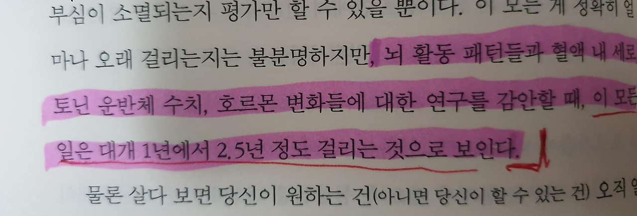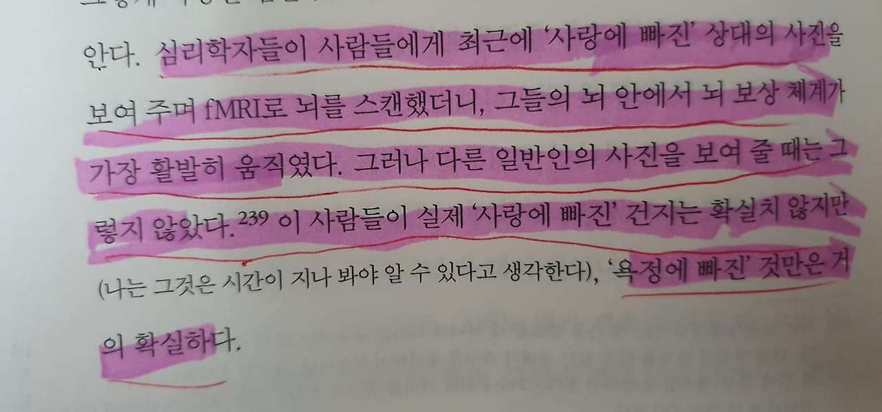 그리고 이 책에서 내가 가장 좋아하는 대단하고 생각한 부분은 욕정, 로맨틱 사랑, 동반자적 사랑의 차이에 대해서 구분한 것이다. 책 처음에 설명이 잘 나오니깐 꼼꼼하게 읽어보기를 바란다. 그리고 한 실험에서 사랑에 빠진 사람에 대해서 fMRI로 뇌를 스캔했는데 사랑하는 연인의 사진을 봤을 때만 뇌 보상체계가 매우 활발하게 움직였다 이것은 사랑에 빠졌다고는 확신할 수 없지만 “욕정”에 빠졌다는 확신할 결과다. 그리고 연인이 단순히 욕정을 넘어서 진정으로 서로에 대하 깊게 알 수 있는 시기는 여러 실험 결과들을 종합해본 결과 1년에서 2.5년 정도 걸리는 것으로 보인다고 작가는 조언한다.