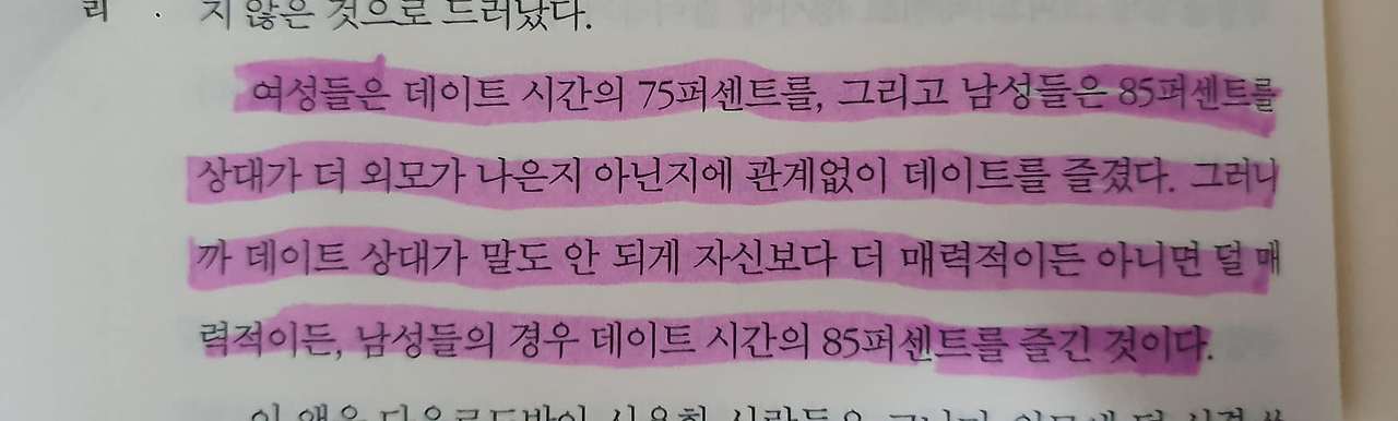 그리고 이 책의 백미는 사랑을 과학과 통계적 관점으로 매우 객관적으로 바라본 것이다. 예를 들면 어떤 데이트 어플이 상대방의 사진을 보지 못한 상태에서 만 명이 실제로 만나서 데이틀 했다. 그런데 결과는 놀라왔다. 여성의 75% 그리고 남성의 85%가 외모의 관계 없이 데이트를 즐겼다고 대답했다.