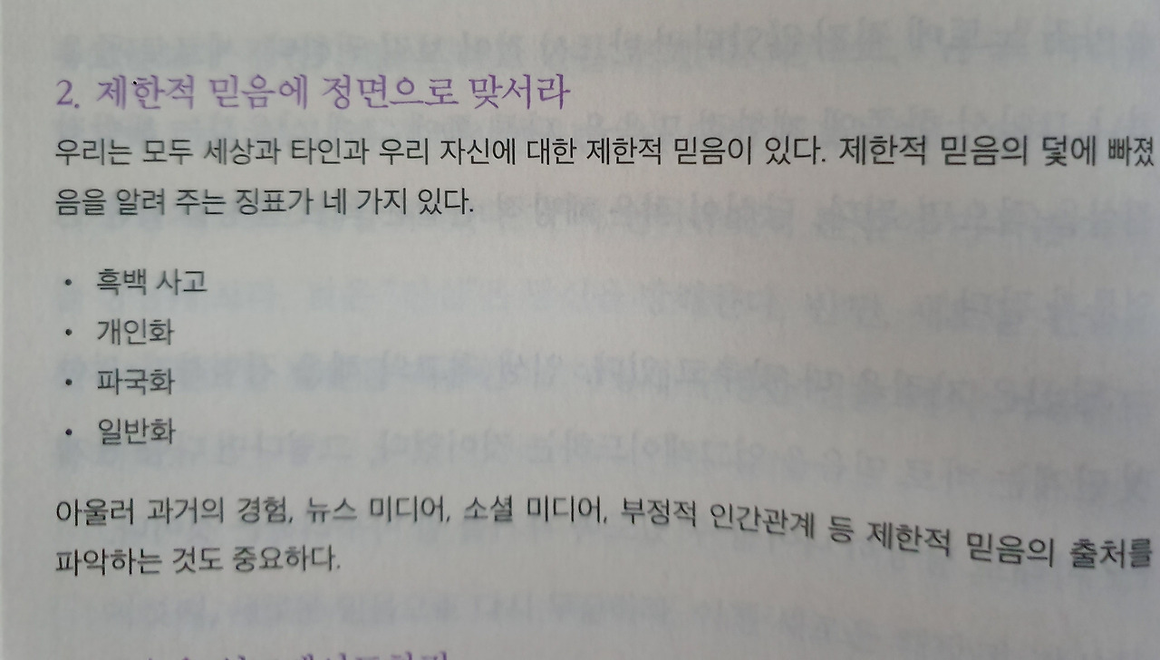 마지막은 리더십이다. 우리나라는 정말 연공서열 문화가 주류 문화여서 리더십이라는 것이 존재하지 않는 조직이 많다. 그냥 나이 많은 사람이 어떤 “장”잡고 있는 경우가 대부분이다. 그러니 어떤 지시를 해도 사람들이 잘 따르지 않는다. 리더십은 정말 꾸준히 공부를 해서 내공을 쌓아야 하는 분야이다. 예를 들면 이번 책에서 내가 정말 개념적으로 깊게 느꼈던 부분은 목표 설정 구간이다. 안전지대와 망상지대의 중간 사이인 불안 지대가 목표설정을 하기 위한 최적한 구간이라는 부분은 정말 다른 사람에게 목표를 설정할 때 어떻게 해야 하는지 설명해주기 좋은 프레임이었다. 그리고 또 제한적 믿음을 만들어내는 흑백 사고, 개인화, 파국화, 일반화도 그 범주를 적절하게 설정하게 아주 탁월하게 설명하였다. 정말 읽어보면 도움이 많이 될 것이다. 이렇게 꾸준하게 다양한 분야에서 교양을 체계적으로 쌓지 않으면 리더십을 양성하기는 쉽지 않다. 리더십이 없으면 나이가 들면 들수록 설 자리를 잃게 될 것은 자명하다. 그래서 우리는 반드시 자기계발을 해야 한다.