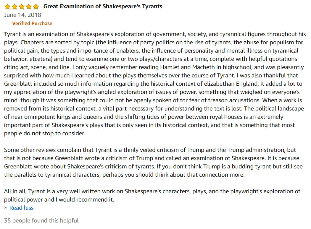 그렇게 그들은 실제로 폭군에 가장 인접한 당사자이고 또 몇몇은 여러 영역에서 자의 혹은 타의로 폭군이 되어있다. 역사적으로 가장 천재 작가로 불리는 세익스피어와 시대의 석학 스티븐 그린블렛 교수님의 조합은 마치 설민석 강사가 역사를 시대상에 맞게 재미있고 알차게 풀어주는 것과 비슷했던 것이 아닐까 추측해본다. (세익스피어를 직접 읽어서 이런 통찰을 얻는 것은 일반인에게 사실 불가능하다.)