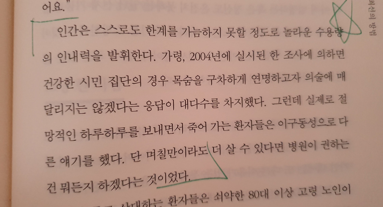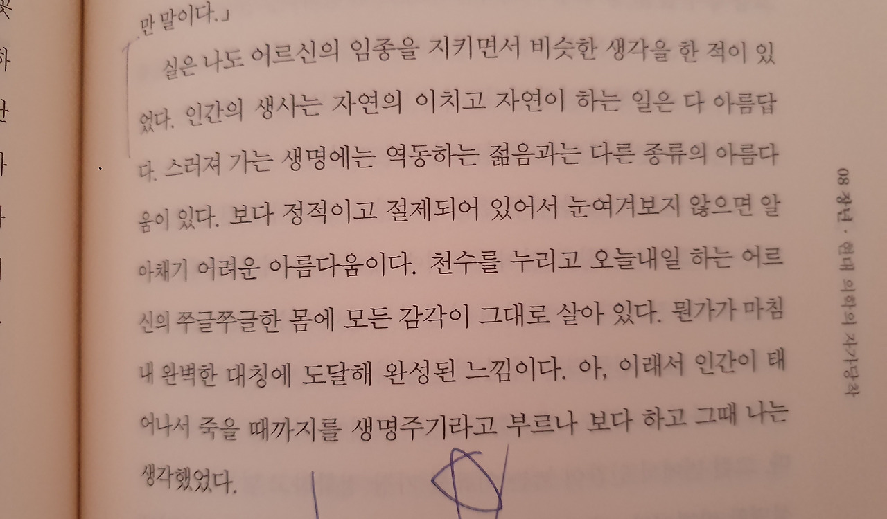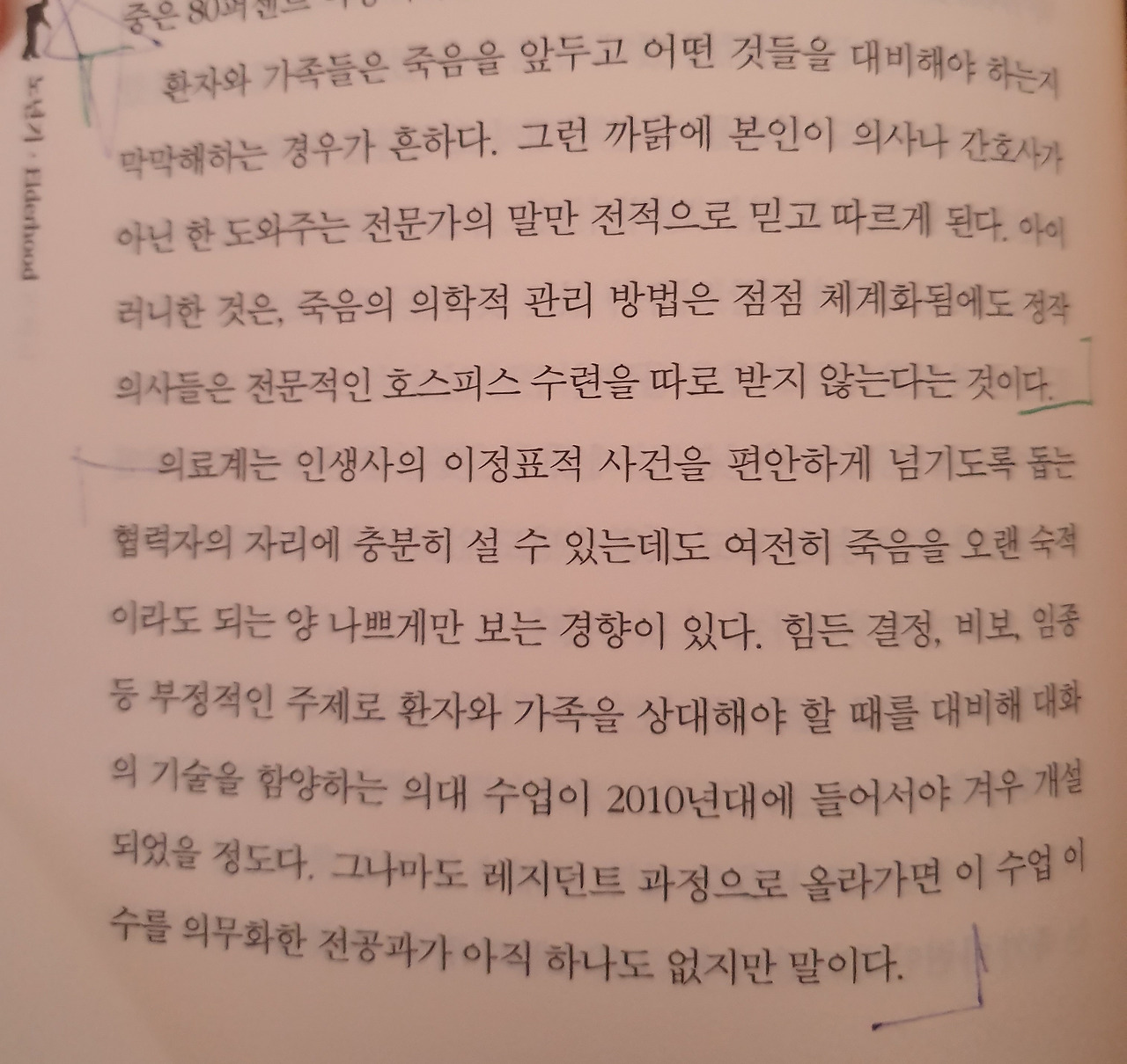 이번에 <나이듦에 관하여>에서 인용한 부분은 정말 모두가 꼭 알아야 하는 부분이다. 죽음은 정말 미지의 영역이고 두려움의 순간이다. 그래서 모두가 그 순간에 의사선생님 및 간호사선생님에게 크게 의존한다. 하지만 의사선생님도 그 순간에 생물학적 이해를 넘어서는 거의 모르는 경우가 많다. 심지어 어떻게 대화를 하고 위로를 해줘야 하는지 모르는 분들도 많다. 그래서 나는 정말 모든 분들이 내가 예전에 인생 책으로 추천한 <인생의 마지막 순간에서>도 꼭 읽어 보기를 바란다.
