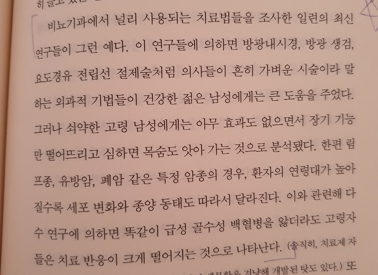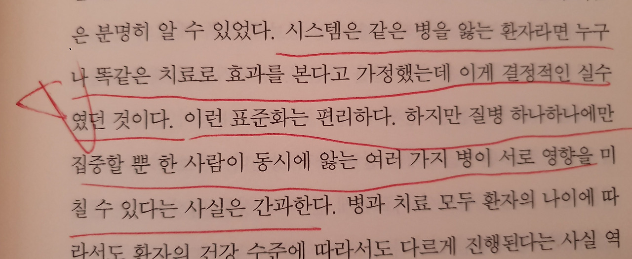 위의 <나이듦에 관하여> 인용한 부분을 보면 놀라운 사실을 발견할 수 있다. 여러분이 노인이 되어서 병원에 갔을 때 일반적인 치료법이 여러분에게 전혀 도움이 안될 수도 있고, 심지어 해로울 수도 있다는 점이다. 이것은 의사들이 잘못이 아니라 시스템의 문제이다. 미국은 노인의학과 전문의가 이제 자리를 잡아가고 있지만 우리나라는 없다. 그래서 스스로 인지하고 공부하고 있어야 한다. 소아과가 존재하는 이유는 성인과 다른 처방과 치료를 받아야 하기 때문에 그런 것이다. 노인도 생물학적으로 일반 성인과 많이 다르기 때문에 상황에 적합한 처방이 필요한 사실을 최소한 꼭 인지는 하고 있어야 한다.