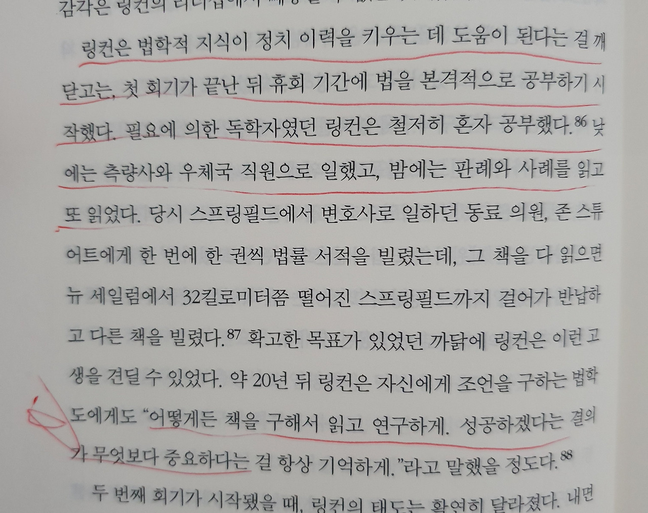 정말 모든 부분에서 감명을 받았지만 딱 두 구절 정도만 소개하면 링컨에 관한 내용인데 링컨은 독학으로 변호사가 되었다. 낮에는 측량사와 우체국 직원으로 일하고 밤에는 판례와 사례를 공부해서 변호사가 되었다. 그리고 나중에 자신에게 조언을 구했던 법학도에게 한 말이 정말 뇌리에 깊게 남았는데 “어떻게든 책을 구해서 읽고 연구하게. 성공하겠다는 결의가 무엇보다 중요하다는 것을 항상 기억하게.”라고 말했다. 이 책을 읽으면서 링컨의 삶을 이해하고 나면 저 말이 어떤 의미인지 정말 독서가 얼마나 중요한지 깨닫게 될 것이다. 여기에 나오는 독서에 관한 링컨의 일화들은 나 자신을 부끄럽게 만들 정도로 대단하다.