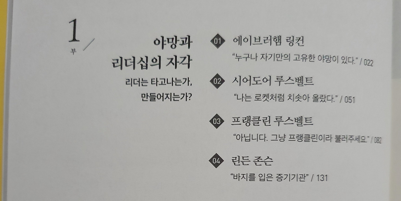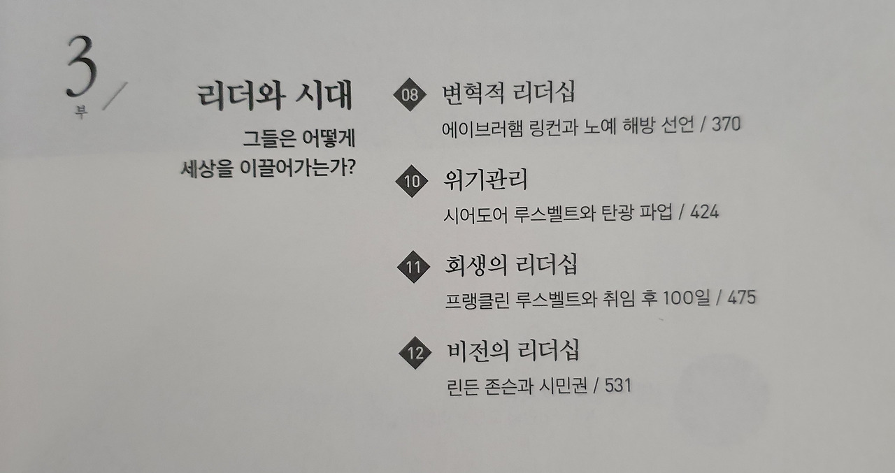 이 책은 아래와 같이 크게 3챕터로 구성되어 있고 내가 가장 감명 받았던 부분은 챕터 2인 [역경과 성장]이다. 이 부분을 읽으면 반성과 감탄이 계속 이어지고 뭔가 할 수 있다는 의지가 솟구쳐 오른다. 그리고 3장 [리더와 시대]는 데일 카네기 인간관계론 심화버전이다. 구체적으로 사건마다 어떤 교훈을 얻을 수 있는지 철저한 팩트 중심으로 설명이 되어 있다. 개인적으로 정말 바쁜 사람은 챕터2만이라도 꼭 읽고 여유가 있는 사람은 챕터2,3을 읽고 인생에 깊은 내공을 쌓고 싶은 사람은 책을 통째로 씹어 먹어야 한다.