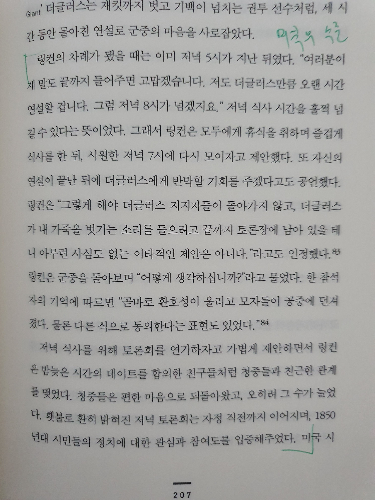 그리고 다음은 19세기의 미국의 정치 연설과 토론 문화를 보여주는 한 대목이다. 저 구절을 읽으면서 과연 우리는 지금 19세기 미국보다 더 뒤쳐진 정치토론 문화를 가진 것이 아닌가 반성하게 될 정도로 미국이라는 나라가 그냥 세계 최강국이 된 것이 아님을 알 수 있었다. 이런 글을 읽으면서 단지 사례를 국가 범위에서만 생각할 필요는 없다. 과연 가정, 학교, 회사에서 우리는 저렇게 합리적이고 논리 정연하게 이야기를 나누고 있는지 우리 자신을 되돌아 봐야 한다.