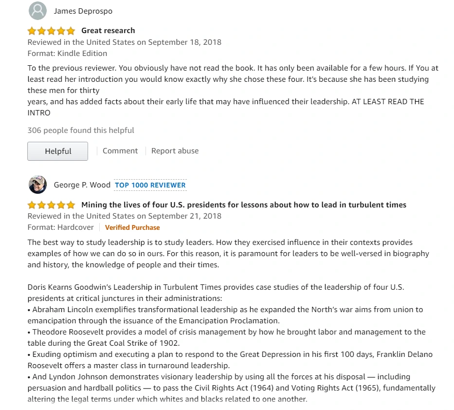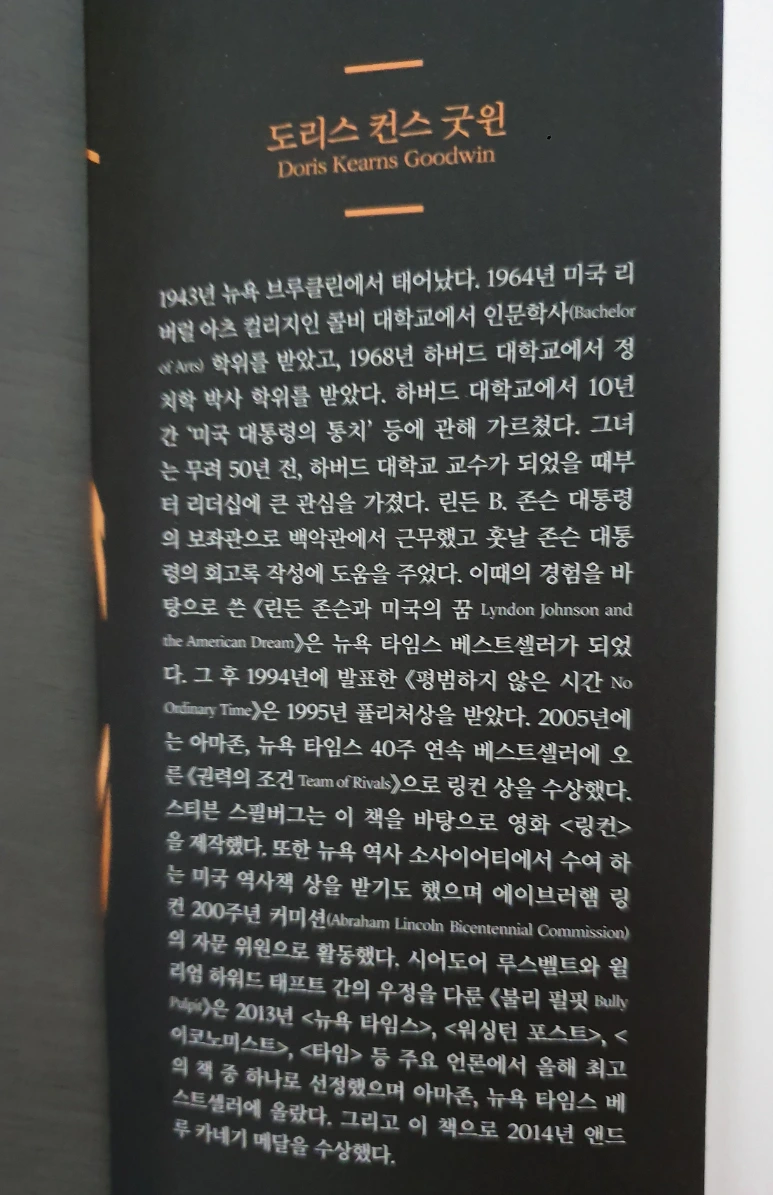 일단 저자 굿인 박사는 클래스 자체가 넘사벽이다. 하드버 대학교에서 정치학 박사 학위를 받았고 집필한 저서 중에 하나로 퓰리쳐 상을 받았다. 그가 출간한 <Team of Rivals>으로 링컨상을 받았고, 그 책을 읽은 스필버그는 영화 <링컨>을 제작했다. 굿윈 박사는 단순히 에피소드를 말하는 것이 아니라 연구 결과를 토대로 책을 쓰기 때문에 깊이가 차원이 다르다. 그리고 이 책의 주인공 중에 하나인 린든 존슨 대통령의 보좌관으로 일했다. 나는 사실 린든 존슨 대통령을 잘 몰랐지만 이 책에서 가장 흥미진진하고 많은 교훈을 얻을 수 있는 인물 중에 한 명이 존슨 대통령이다. 링컨의 관한 최고 연구자가 책을 쓰고 대통령의 보좌관이었던 사람이 그를 관찰하고 직접 책을 쓴다?? 과연 이렇게 최고 수준의 책을 쓸 수 있는 위치에 있는 사람이 몇이나 있을까? 이런 책은 그냥 “고맙습니다.”하고 읽으면 된다.