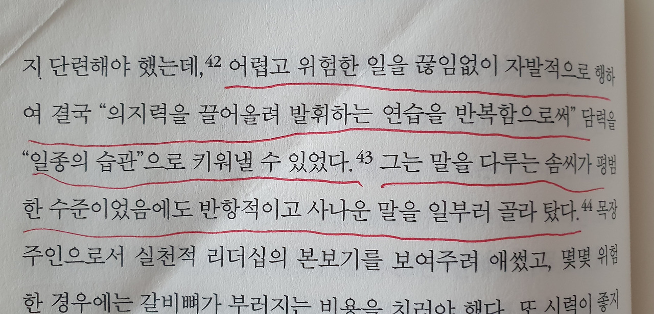 그렇다. “진짜 위기는 그것이 위기인지 모르는 것이다. 더 위험한 것은 알면서 아무것도 하지 않는 것!” 지금의 대부분 40대는 유재석이 말한 환경에 정확하게 노출되어 있다. 그래서 그들에게 강력하게 추천하는 책이 <혼돈의 시대 리더의 탄생>이다. 지금의 40대가 직장인이라면서 과장부터 부장의 위치 정도에 대부분이 있을 것이고, 자영업자라면 벌써 몇 번의 위기를 경험했거나 지금 위기를 온몸으로 겪고 있을 것이다. 그런 상황에서 지금 가장 필요한 것은 리더십이다. 우리나라는 연공서열과 호봉제 같은 문화 때문에 제대로 된 리더십이라는 것이 없다. 특히 40대는 전혀 다른 50/60대와 20/30대 사이에 위치해 있기 때문에 절묘한 리더십을 발휘하지 않으면 정말 힘든 시기를 겪게 될 확률이 높다. 그렇다면 리더십은 어디서 나오는 것일까? 일단 나이는 아니다. 연륜은 공부와 경험 그리고 반성이 누적되었을 때 쌓이는 것이지 그냥 지구가 태양을 한 바퀴 돌았다고 나에게 주어지는 선물이 아니다.