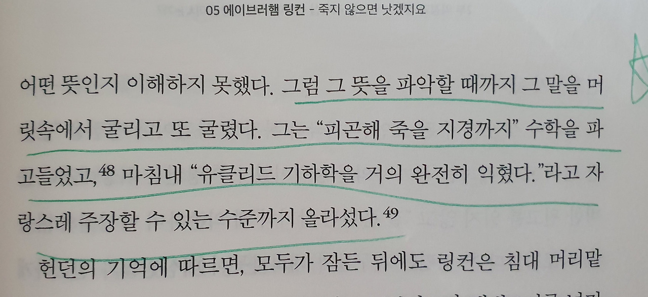 <혼돈의 시대 리더의 탄생> 아래 인용한 대목에서 나는 반성을 하고 또 했다. 40대 저렇게 열심히 공부할 수 있을까? (이것도 시대적 나이로 환산하면 40대 후반이 될 것이다.) 심지어 20대에도 잘 못했던 수학을 40대에 읽고 또 읽어서 링컨처럼 깨우칠 수 있을까? 이 대목을 정말 몇 번을 곱씹었는지 모른다.
