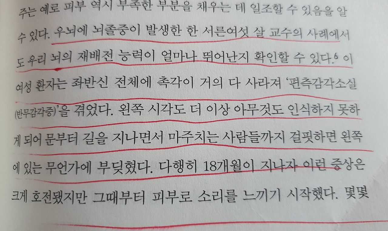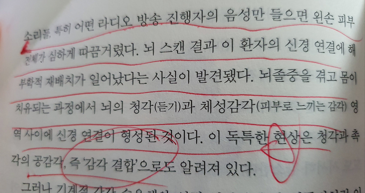 위의 사례는 뇌의 가소성이 얼마나 놀라운지 보여주는 사례이다. 실제로 이야기의 주인공은 피부로 소리를 느끼기 시작했다. 어떤 일이 발생했는지 뇌 스캔을 해보니 뇌의 청각과 피부로 느끼는 감각이 영역 사이에 신경 연결이 형성되었다. 많은 사람들이 대화를 통해서 혹은 상대방을 관찰하면서 소통을 하려고 하지만 촉을 통해 느끼려고 하는지는 의문이다. 일단 앞에서 언급한 것처럼 피부는 가장 큰 감각기관이지만 그것을 감각기관으로 인지하고 있는 경우는 매우 드물 것 같다. 쉽지는 않겠지만 우리는 피부를 통해 생각보다 많은 것을 느끼고 있다는 사실만 인지하고 있어도 자연스럽게 촉 더듬이는 더욱 발달할 것 같다.