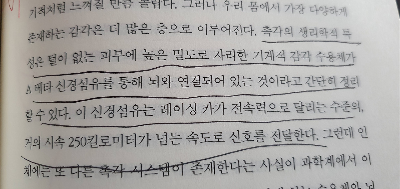 실제로 우리가 피부를 통해 무엇을 느끼면 아래에 언급된 것처럼 피부는 신경섬유를 통해 뇌로 신호를 엄청난 속도로 전달한다고 한다. 느낌이 싸한 순간이 있었다면 실제로 어떤 것을 피부로 느꼈을 확률이 높다. 이렇게 우리가 노력하지 않아도 어떤 시스템보다 알아서 척척 일하고 있는 피부라는 감각기관이 있는데 그것을 잘 모르고 살았다는 사실에 생각보다 더 많이 놀랐다.