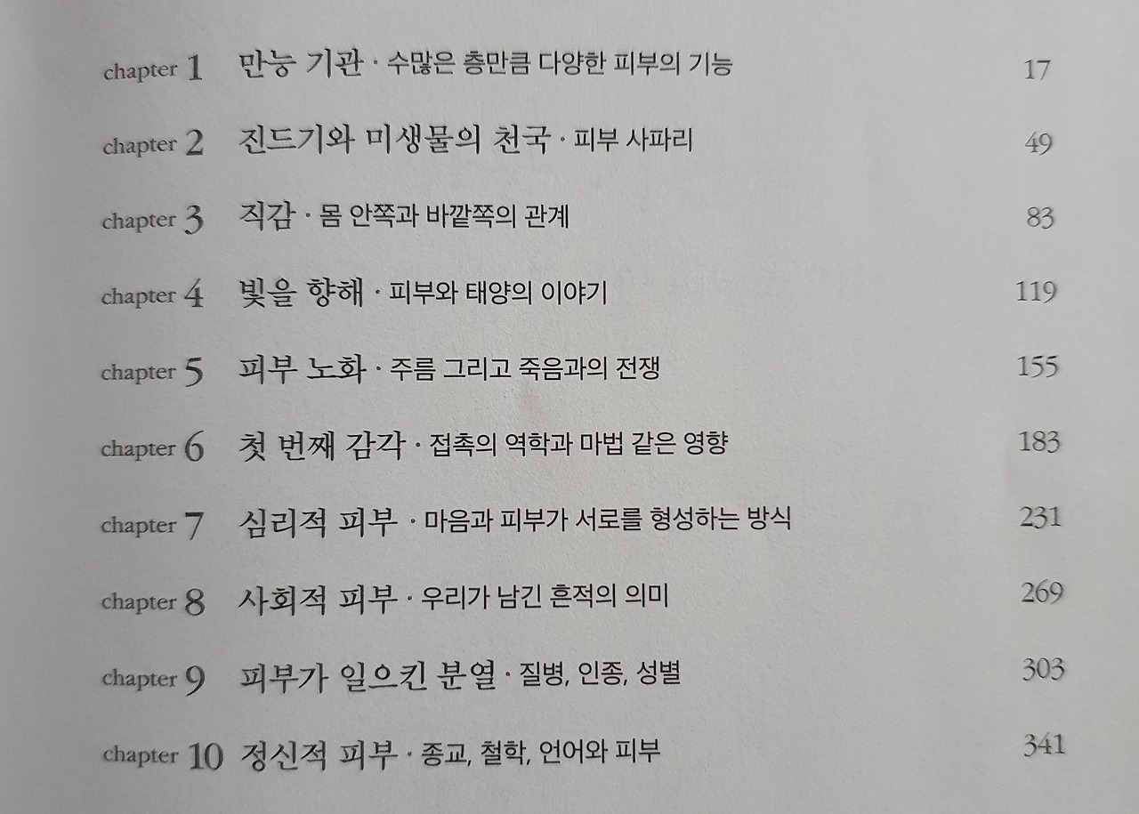 <피부는 인생이다>에는 정말 다양한 이야기가 나온다. 정말 스펙트럼이 넓어서 미용, 건강, 사회적 관계, 과학, 연구 등등 피부를 통해 우리 인생을 풀어간다. 깊은 통찰과 유익한 정보가 넘쳐서 정말 읽고 나면 세상의 새로운 부분이 많이 보일 것이고 정말 필수적인 건강상식도 많이 쌓을 수 있을 것이다. 아래 목차를 보면 구성이 얼마나 탄탄한지 알 수 있다. 작년에 영국왕립학회가 선정한 올해의 책 결선 후보(단 3권)에 올랐던 책인 만큼 아마존 평가에서도 거의 만점에 가까운 극찬을 받았다. 정말 유익한 책이니 모두에게 진심으로 추천하는 책이다.