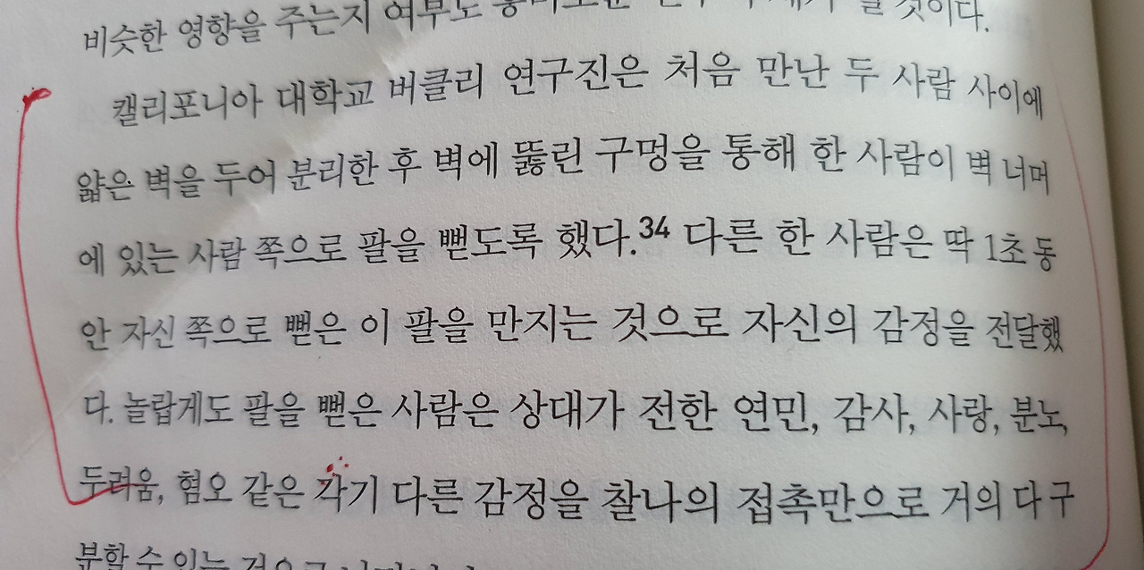 이 책은 피부를 과학적, 사회적 그리고 역사적으로 설명한 엄청난 책이다. 앞에서 우리가 말한 “촉”은 [觸: 닿을 촉] 이다. 바로 접촉과 촉감에 쓰이는 말이다. 피부는 감각기관 중에 가장 큰 기관이지만 우리는 인생에서 피부에 대해 잘 인지하지도 못한다. 아래는 우리가 피부로 얼마나 많은 것을 소통할 수 있는지를 보여주는 놀라운 실험이다.