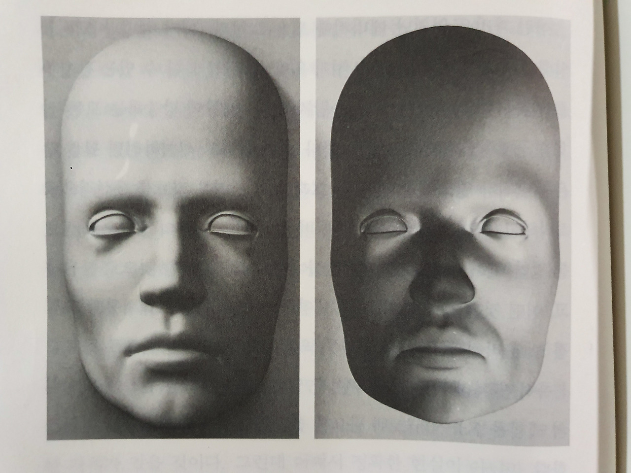 책을 읽으면서 정말 재미있었던 부분 중에 하나는 아래 나오는 가면 그림이다. 두 개의 그림은 사실 똑같은 가면이고 왼쪽 그림은 가면의 오목한 면이 앞으로 나오도록 뒤집어 놓은 것이다. 하지만 놀랍게도 두 가면 모두 볼록한 모양으로 보인다. 아무리 자세히 봐도 볼록하게 보인다. 그 이유는 뇌가 그렇게 신호를 패턴으로 만들어서 해석해버리기 때문이다. 이 사진을 오목한 것으로 볼 수 있는 사람들은 대부분 조현병(정신병) 환자일 가능성이 매우 높다고 한다. 조현병 환자들은 신호를 필터링 할 수 없기 때문에 불필요한 것까지 보게 되어서 정신병에 걸린 사람들이다.